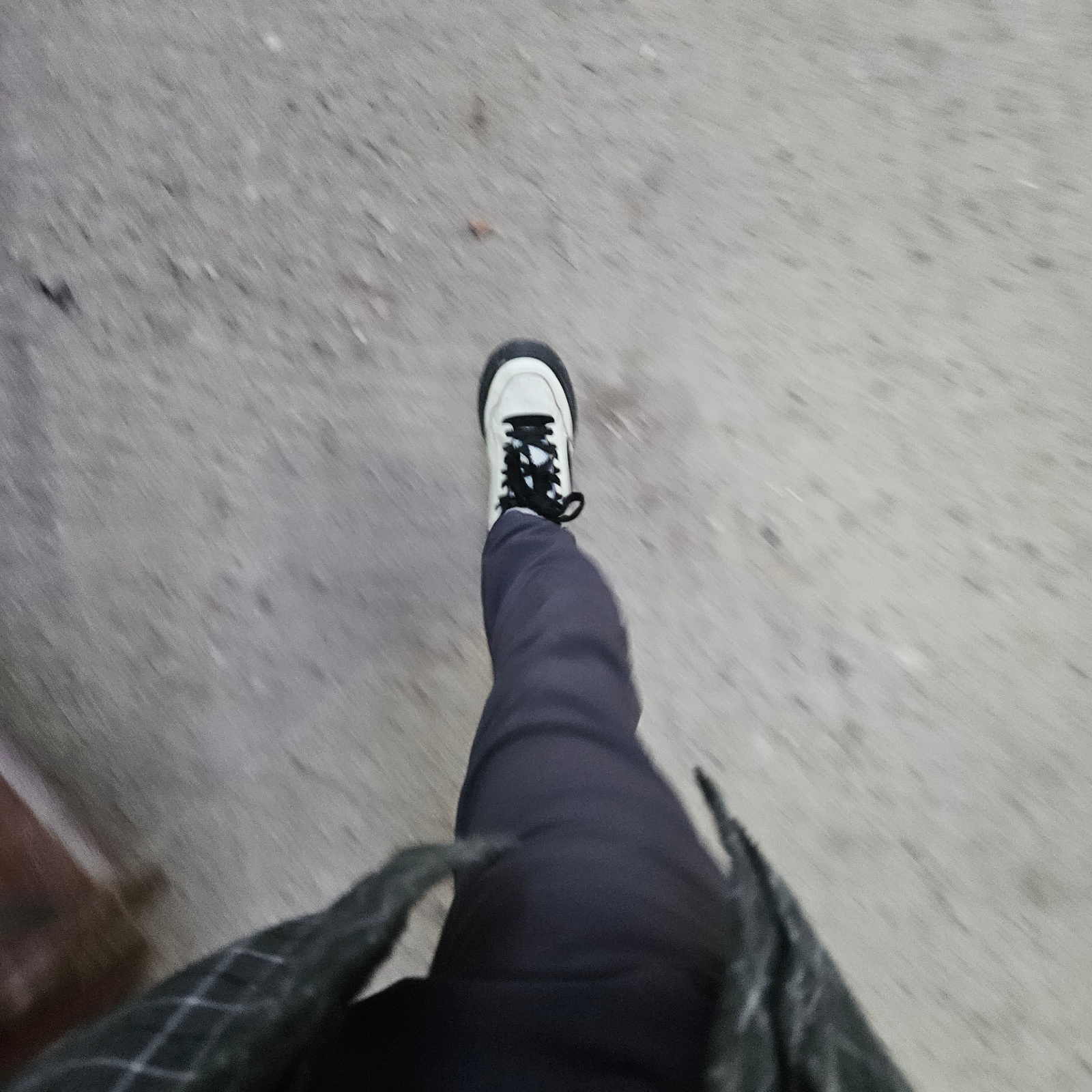 The image shows a downward-angled view of a person walking on a grey concrete surface, likely a sidewalk. The individual is wearing dark trousers and a plaid jacket. The focal point is a white sneakerβ¦read more