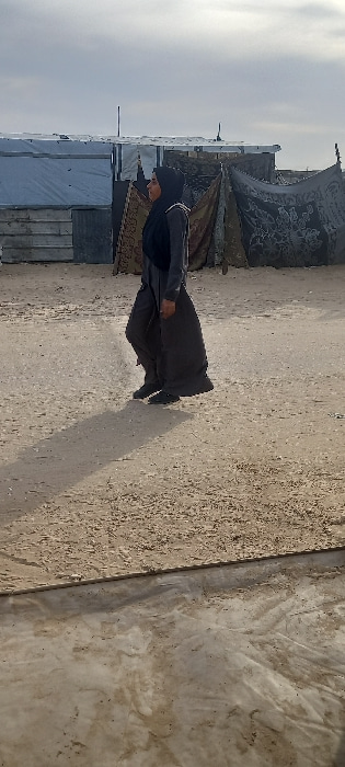 A person wearing dark clothing and a head covering walks across a sandy, uneven surface. In the background, there is a makeshift camp with various tents and coverings, including some adorned with decoβ¦read more