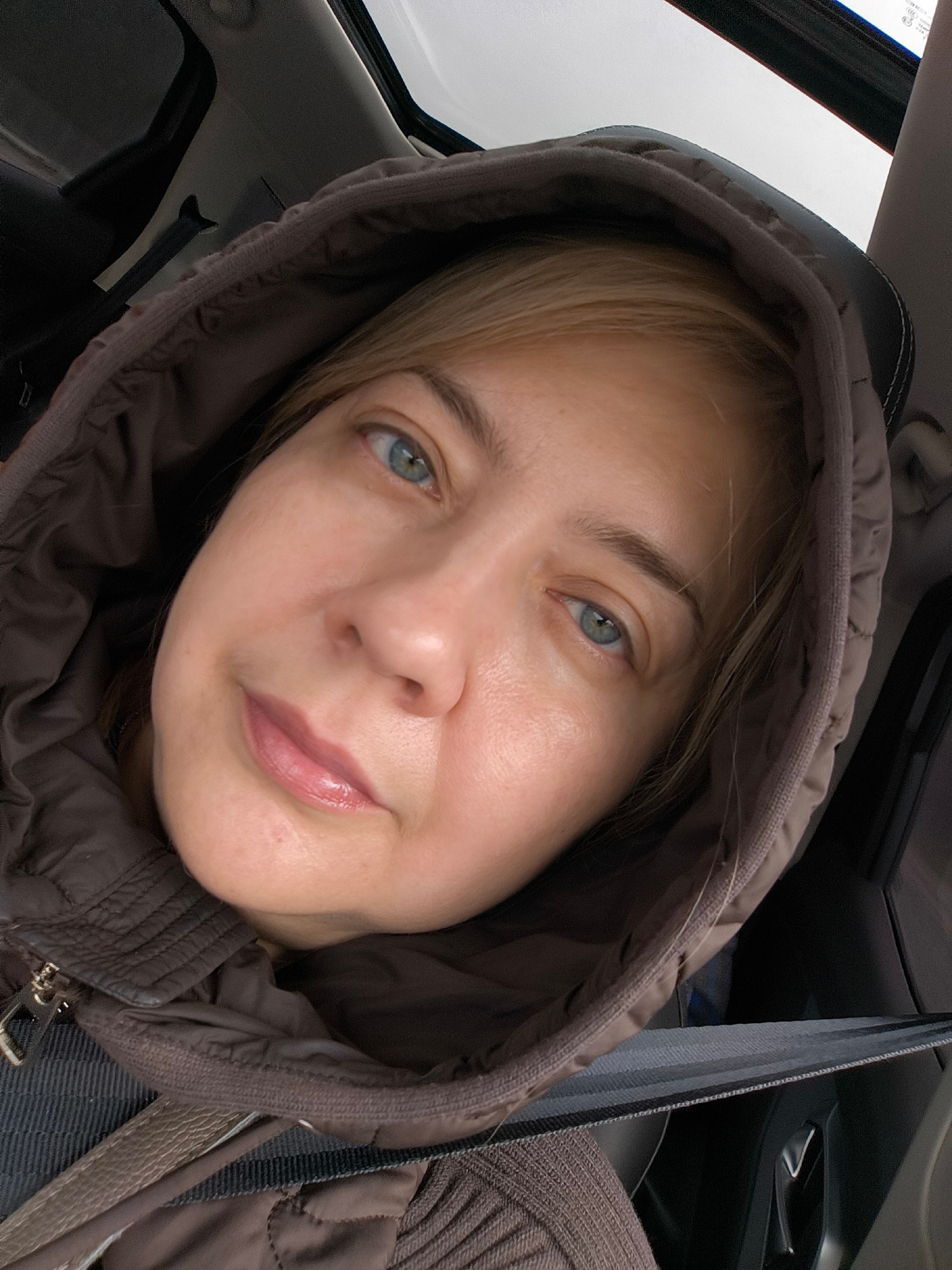 A close-up, angled portrait shows a woman taking a selfie inside a car. Her face is framed by the dark brown or grey hood of her padded jacket. She has blonde hair, light blue eyes, and her lips are p…read more
