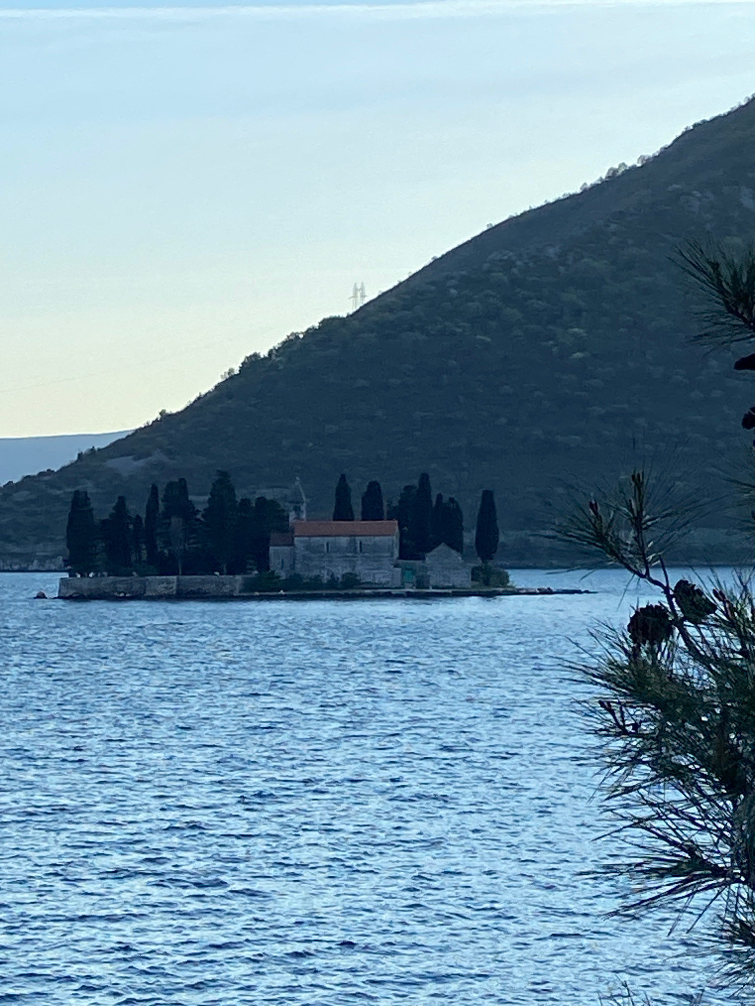 The image shows a view of the Bay of Kotor in Perast, Montenegro. On the right is a body of water, the bay itself, with ripples on the surface. To the left is a hillside covered with trees and foliage…read more