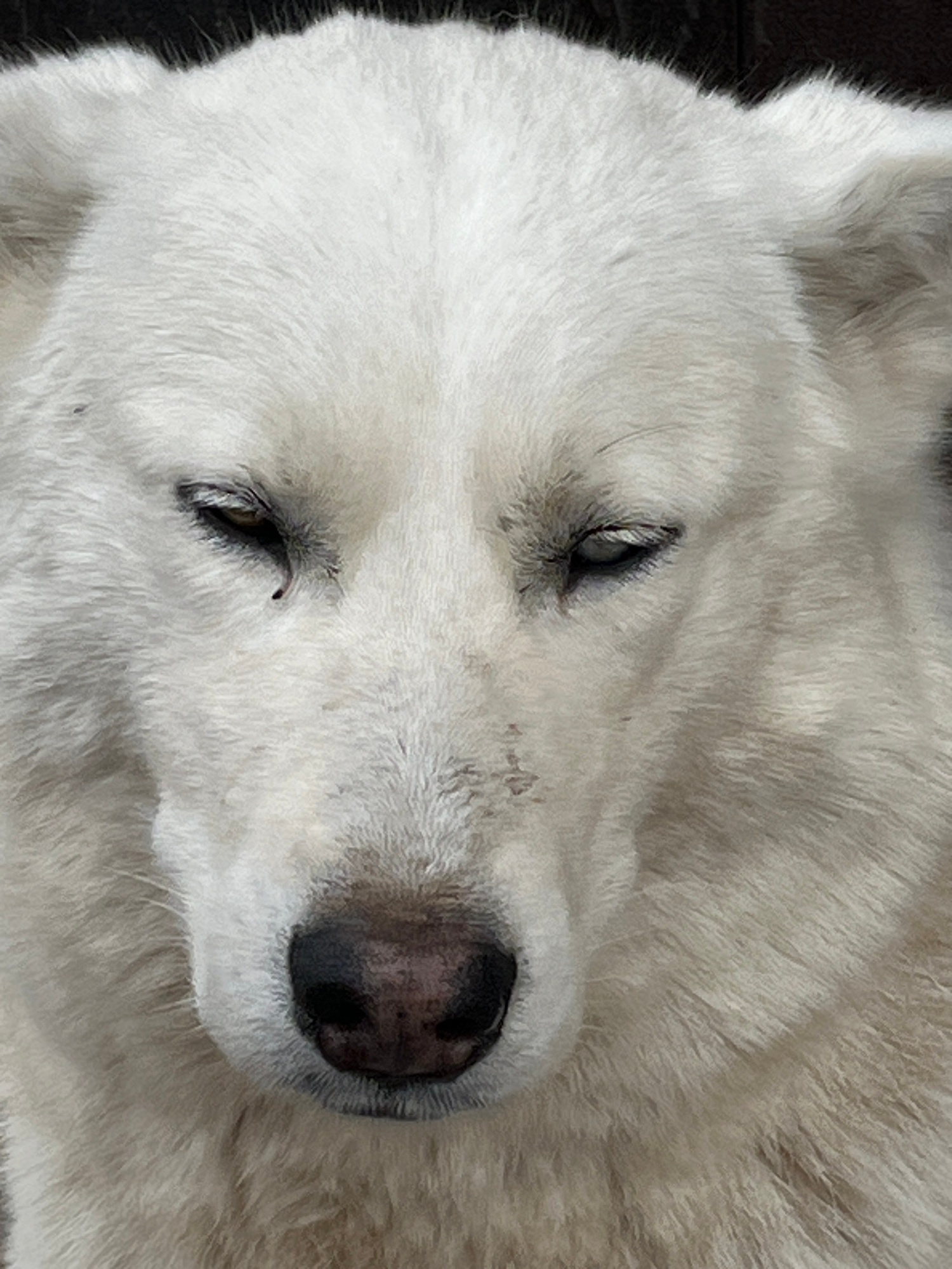 The image presents a close-up, high-angle view of a large white dog resting peacefully. The primary subject is the dog's head, predominantly covered in dense, fluffy white fur. Its eyes are either clo…read more