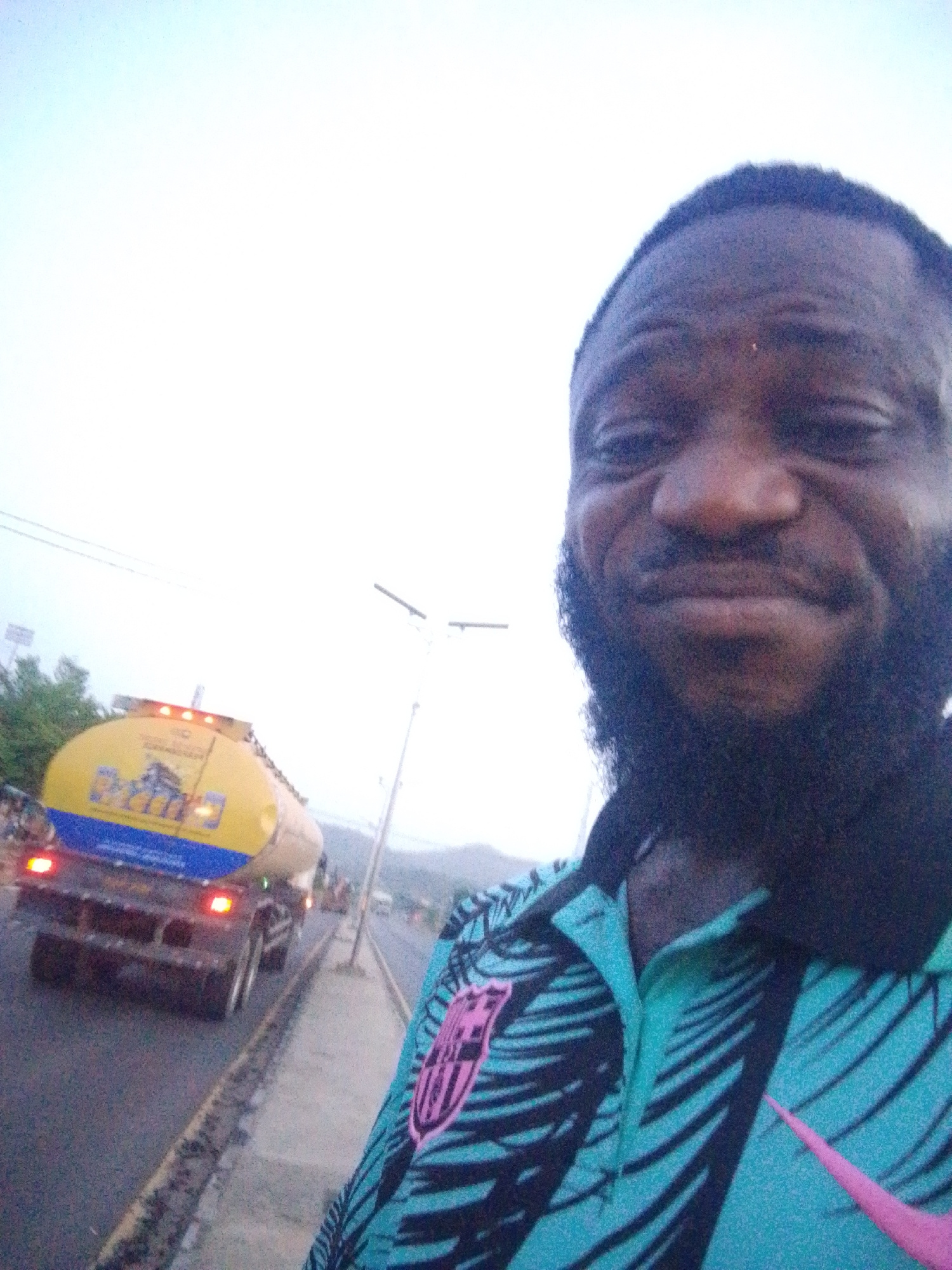 A man with dark skin and a full beard is taking a selfie in what appears to be Lokoja, Nigeria. He's wearing a turquoise and black patterned shirt with a pink Nike logo and a crest that resembles the…read more