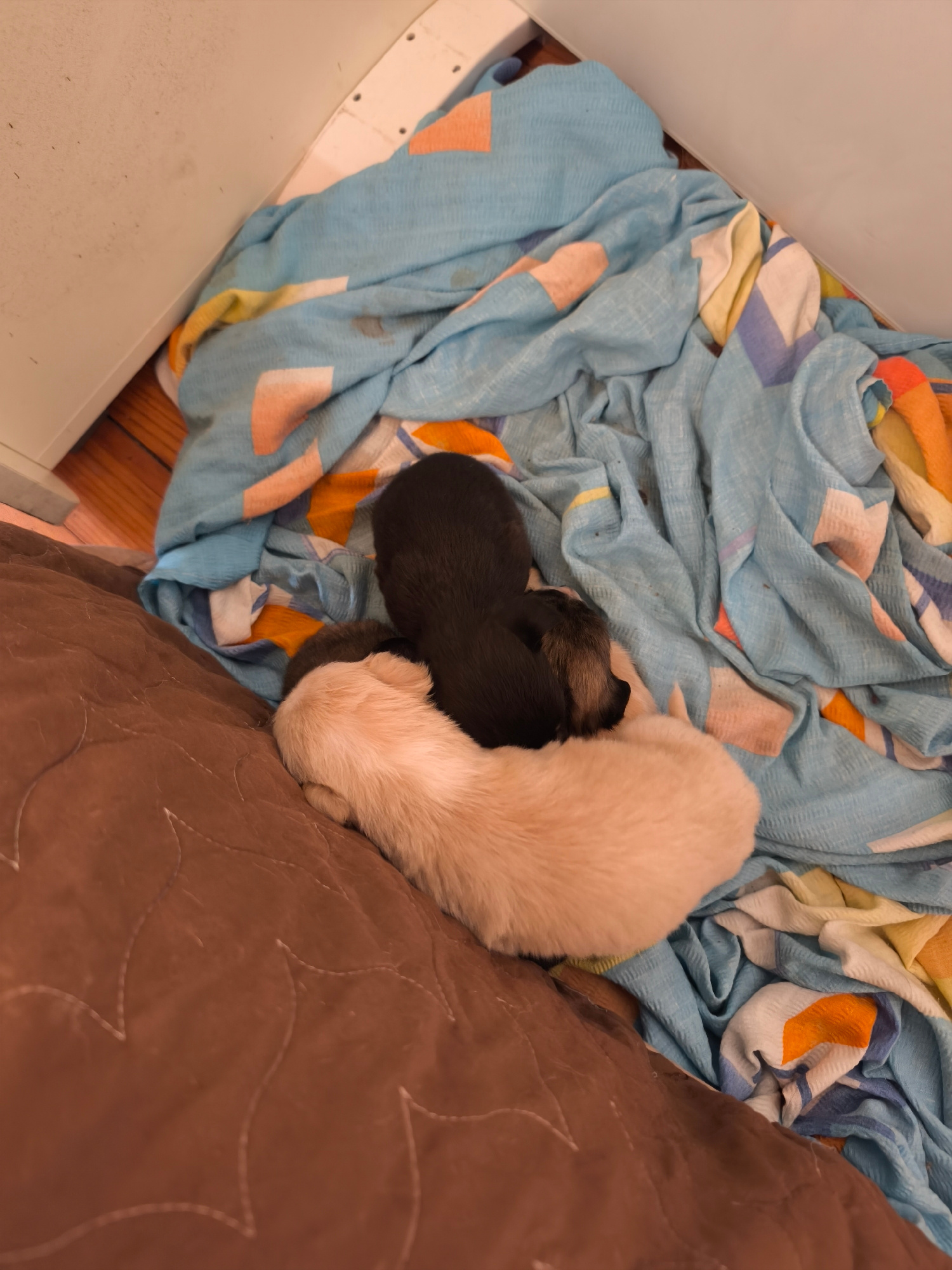 The image shows three puppies sleeping on a brown patterned cushion and a blue patterned blanket. The location is near a white wall in a room, potentially in Avren, Bulgaria. There are no visible peop…read more