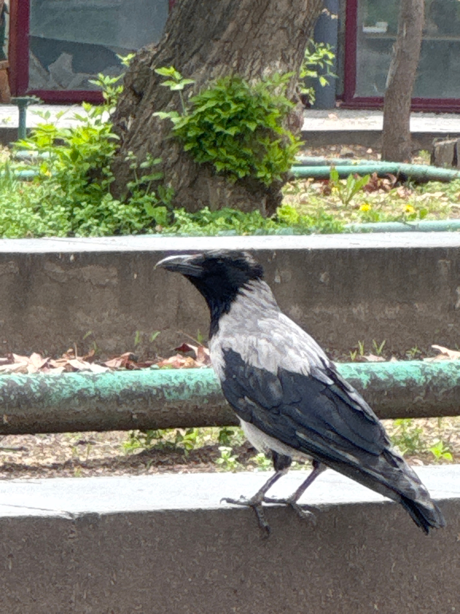 A hooded crow stands on a concrete surface, adjacent to a green painted pipe and a concrete barrier. Lush greenery and a tree trunk are to the left. In the background, a building structure with a burg…read more