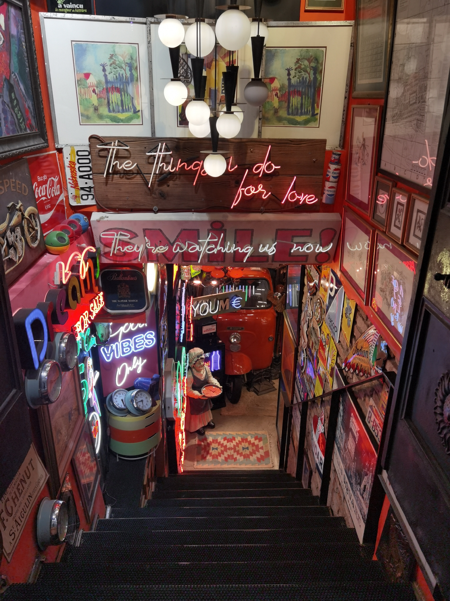 This image captures a vibrant and eclectic interior, likely a shop or entertainment venue, in Beyoğlu, Turkey, viewed from the top of a downward-sloping staircase. The setting is a hallway or entrance…read more
