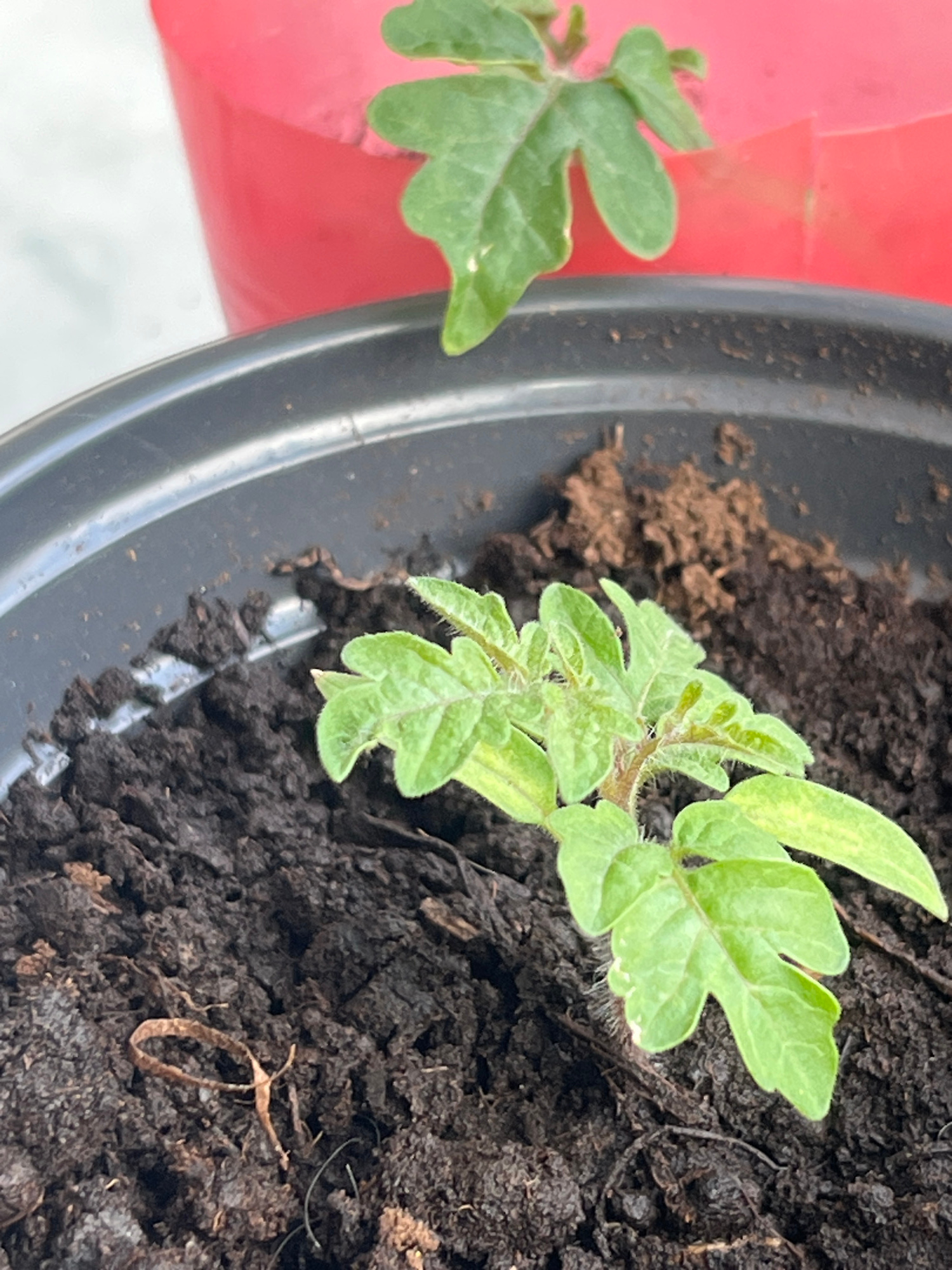A close-up, top-down view captures two small, green plant seedlings, likely tomatoes, in what appears to be a garden or home setting in Krasnoyarsk, Russia. The primary subject is a seedling positione…read more