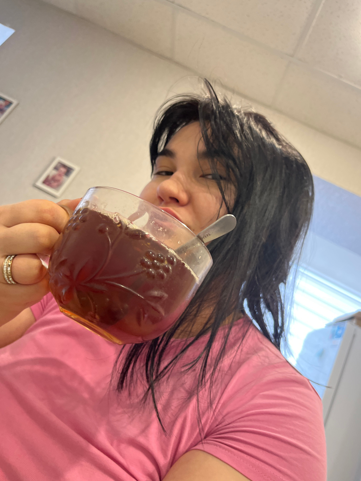 A woman is holding a glass of dark-colored liquid with a spoon inside. She is wearing a pink t-shirt and multiple rings on her fingers. The background includes a white ceiling, a window with blinds, a…read more