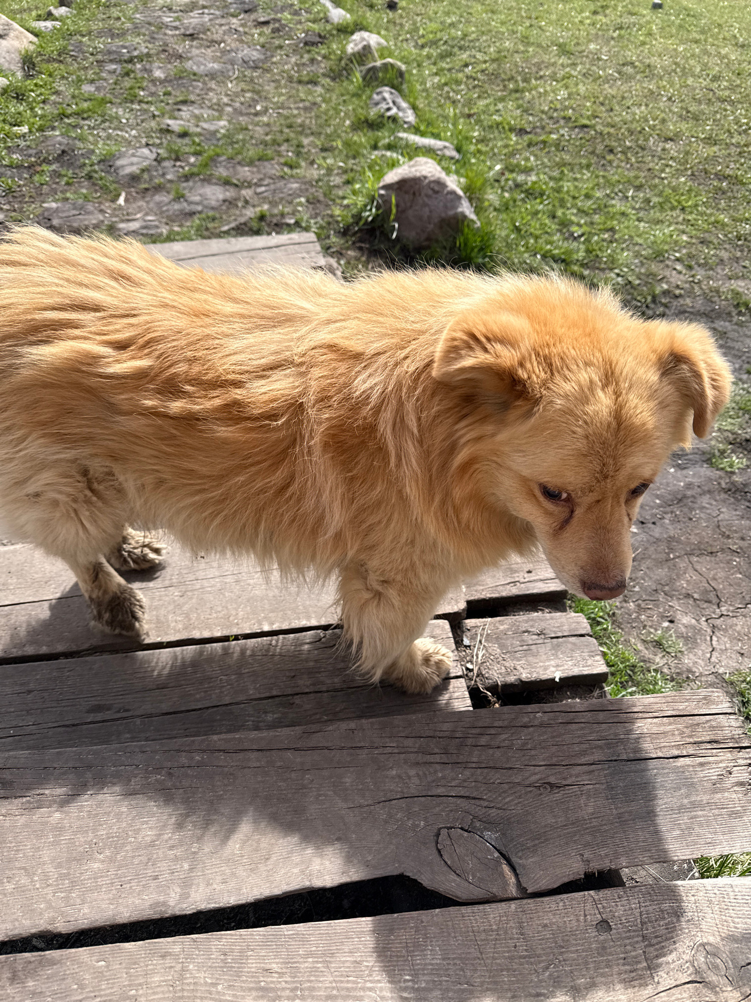 An eye-level shot shows a medium-sized, tan-colored dog standing on a wooden walkway or bridge. The dog faces left with its head tilted upwards. The dog’s fur appears thick and somewhat shaggy. The wo…read more