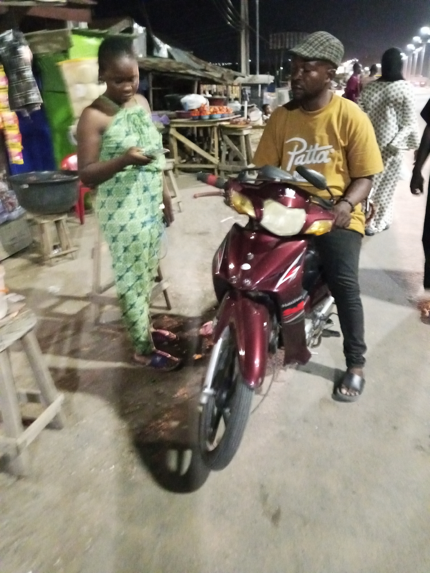 The image depicts a street scene in Adankolo, Nigeria, at night. A woman in a green patterned halter-style jumpsuit stands to the left, looking at a mobile phone. A man wearing a yellow "Patta" t-shir…read more