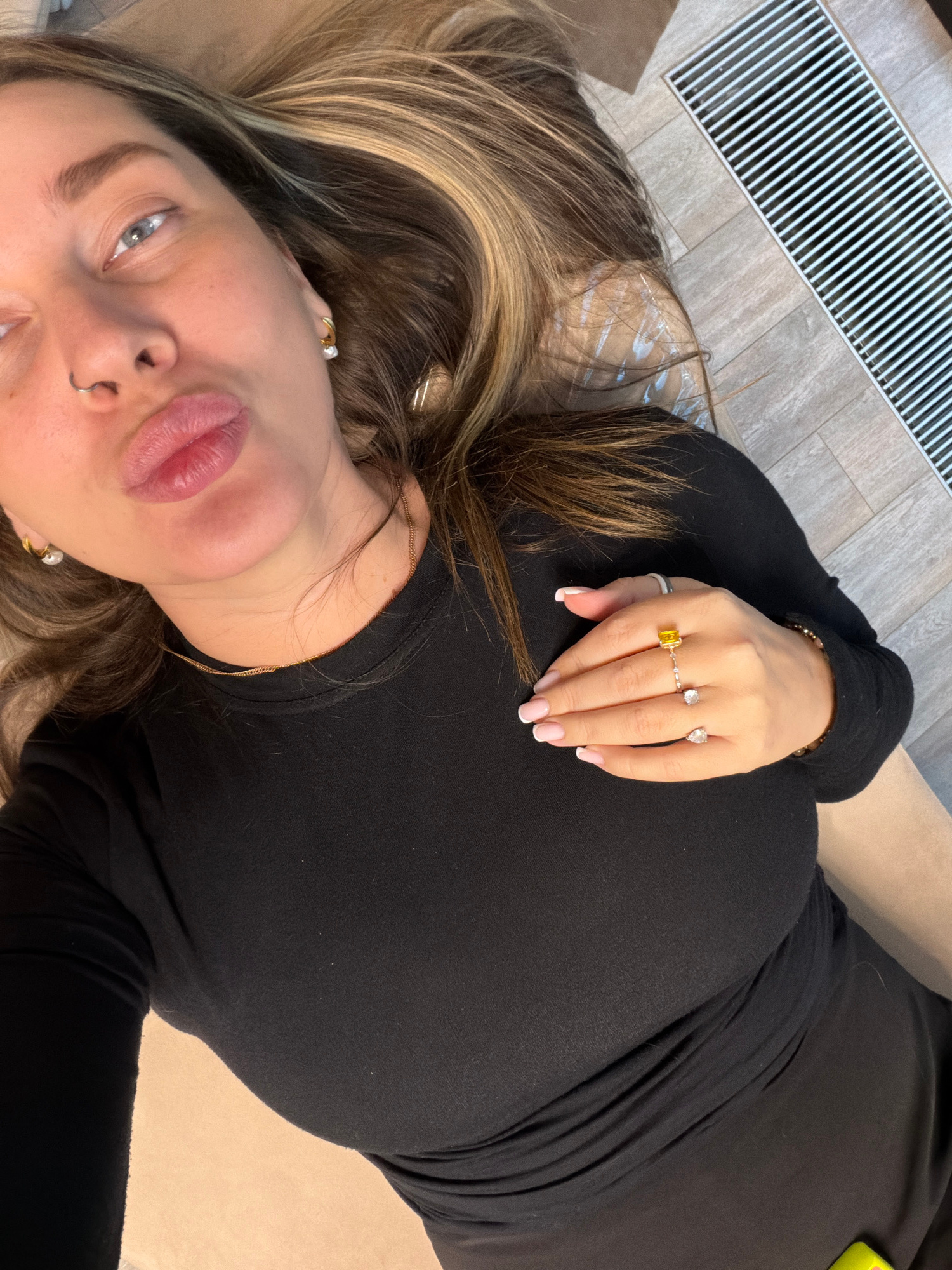 A woman with blonde-streaked brown hair, gray eyes, and a nose piercing is lying on a light brown surface, presumably a bed or couch, in an indeterminate indoor location in Unknown, Unknown. She is we…read more