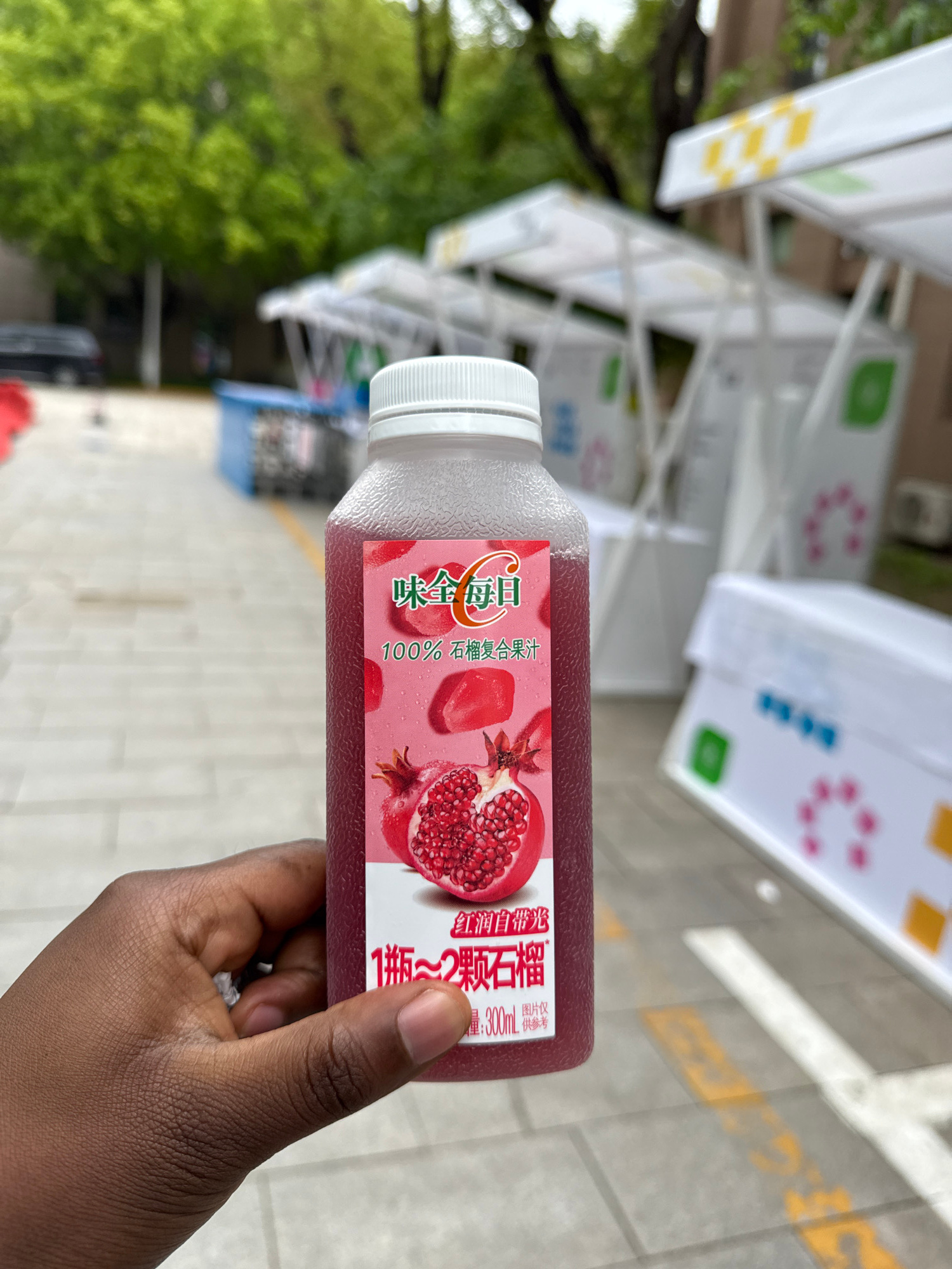 A close-up, slightly rotated shot shows a dark-skinned hand holding a clear plastic bottle of pomegranate juice. The bottle has a white screw cap and contains a red-purple liquid. Its label features a…read more