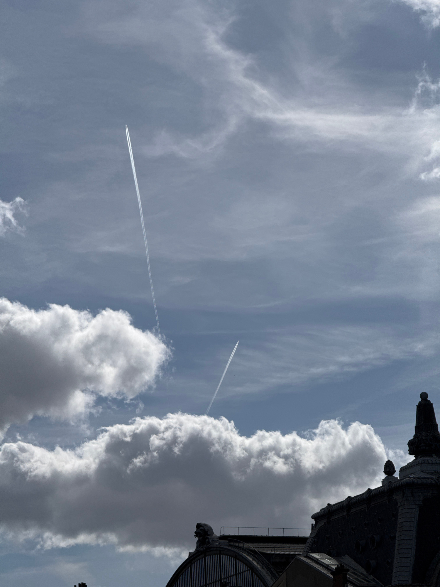 The image displays a vibrant blue sky adorned with various cloud formations and aircraft contrails, with an ornate building partially visible on the right. The sky is the dominant subject, featuring…read more