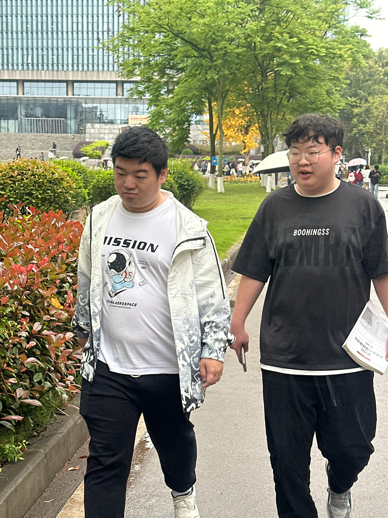 Two Asian men are standing on a sidewalk near a building. The man in the foreground is wearing a white t-shirt with an astronaut graphic and the words "MISSION" and "CHINA AEROSPACE" on it, a light gr…read more