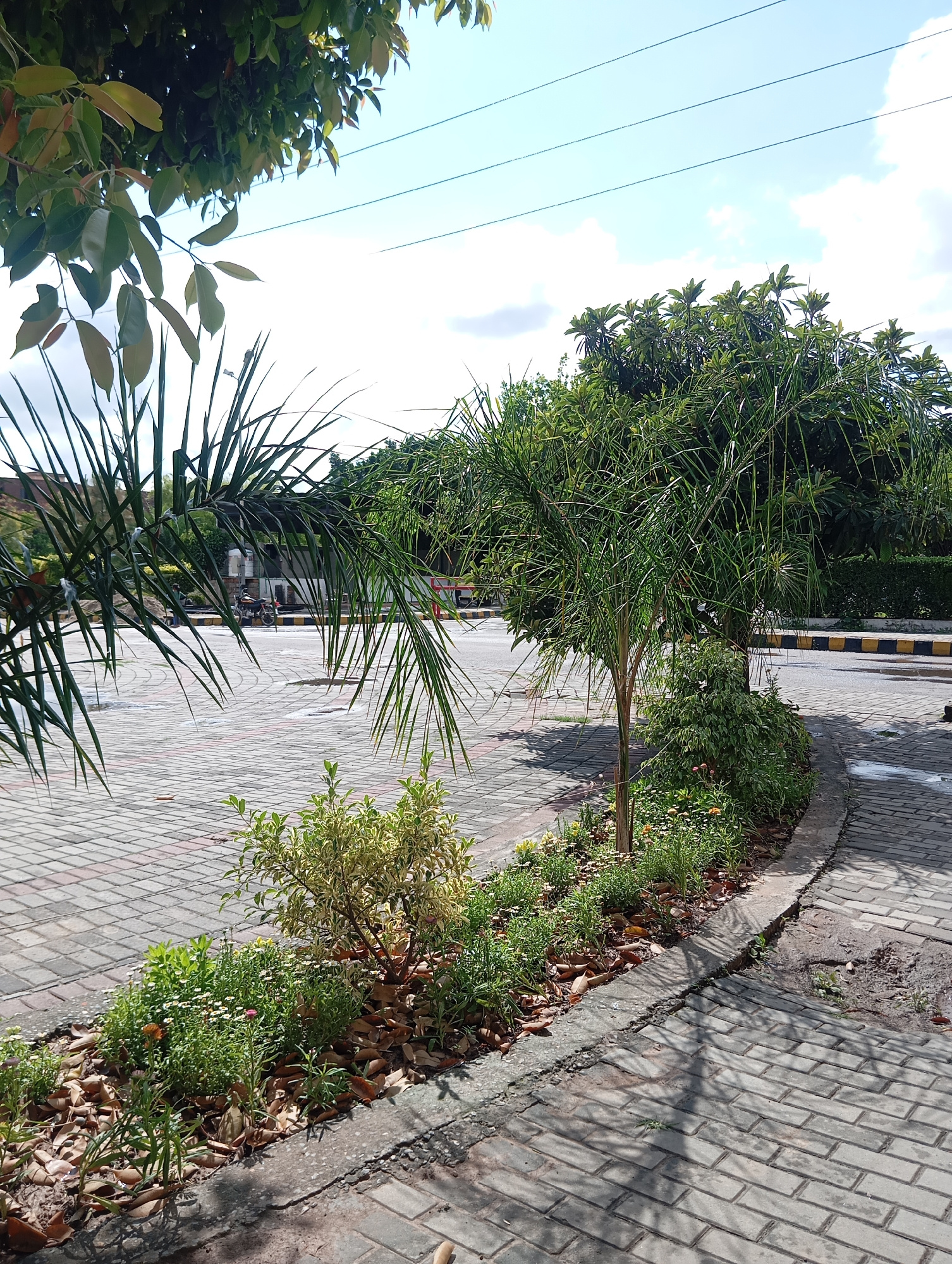 The image captures an outdoor scene in Chah Sultan, Pakistan. The foreground is dominated by a flower bed with a variety of small plants and flowers, edged by a low concrete border. Scattered dried le…read more