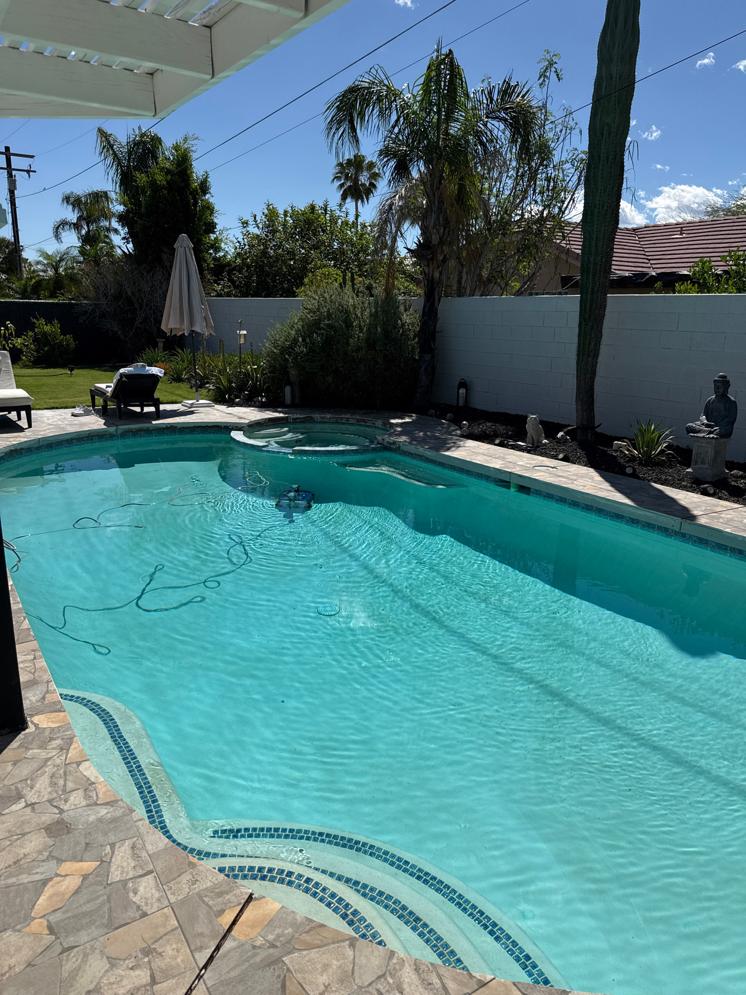 The image shows a residential swimming pool in Palm Springs, California, USA. The pool is filled with clear blue water, and a robotic pool cleaner is visible inside. The pool's edge is decorated with…read more