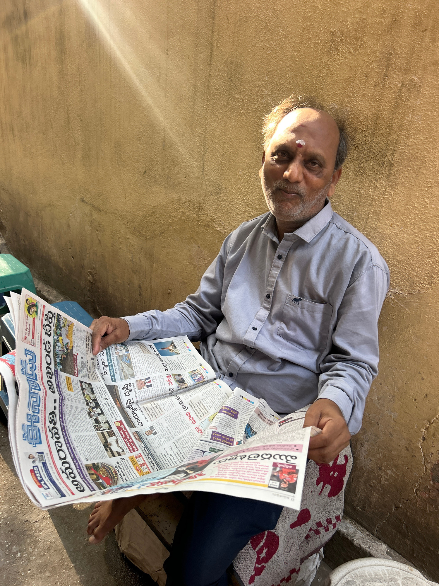 An elderly South Asian man in Puttaparthi, India, sits outside reading a Telugu newspaper. He wears a light blue long-sleeved shirt, dark blue pants, and a white tilak on his forehead. The newspaper i…read more