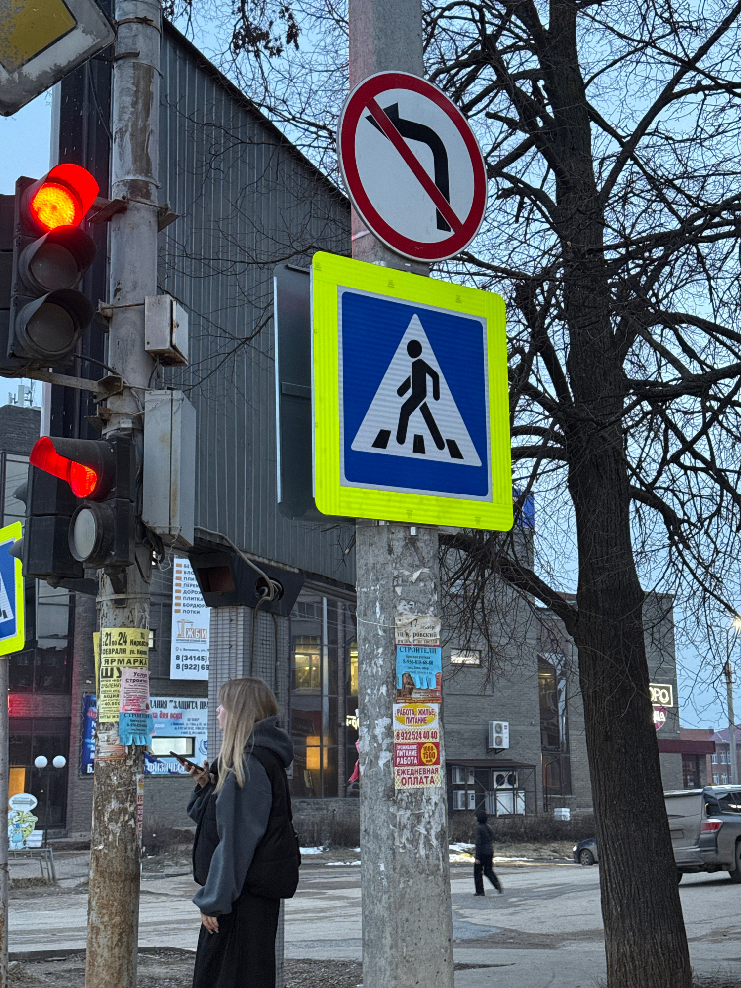 The image depicts a street scene in Votkinsk, Russia, featuring a pedestrian crossing. Traffic lights are visible, with both red and red-and-yellow signals lit. Street signs indicate a pedestrian crosβ¦read more