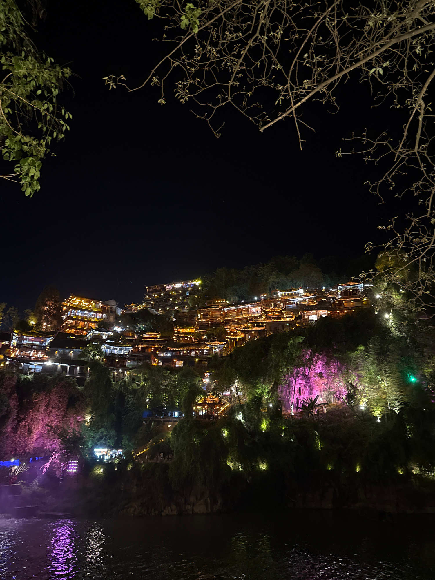 The image shows Furong Ancient Town in Hunan Province, China, at night. The town is illuminated with warm, orange lights, creating a warm glow. The lights reflect off the water. The scene is framed by…read more