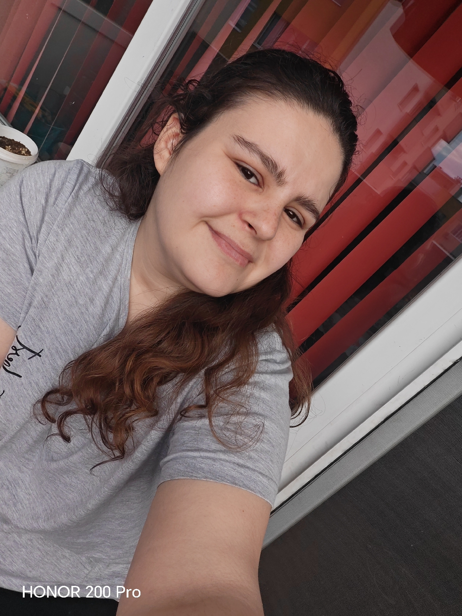 A selfie of a woman with brown hair, wearing a gray t-shirt, is taken indoors near a window with red and black blinds. The window reflects an exterior view of a building. A small white pot with soil i…read more
