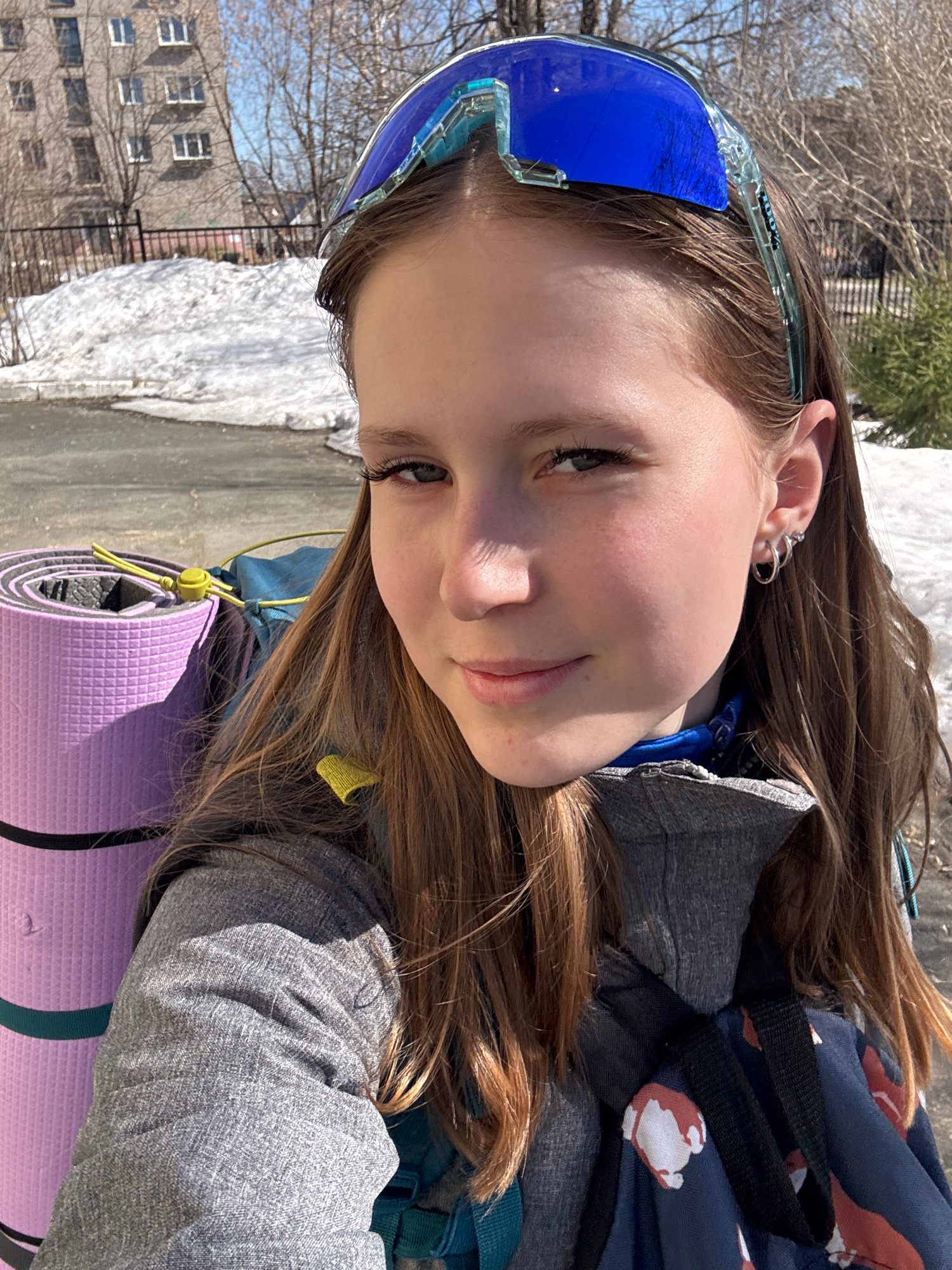 A young person is posing outdoors with a rolled-up purple yoga mat visible in the foreground, and possibly wearing a gray jacket and blue goggles. Behind the person is a building and some patches of s…read more