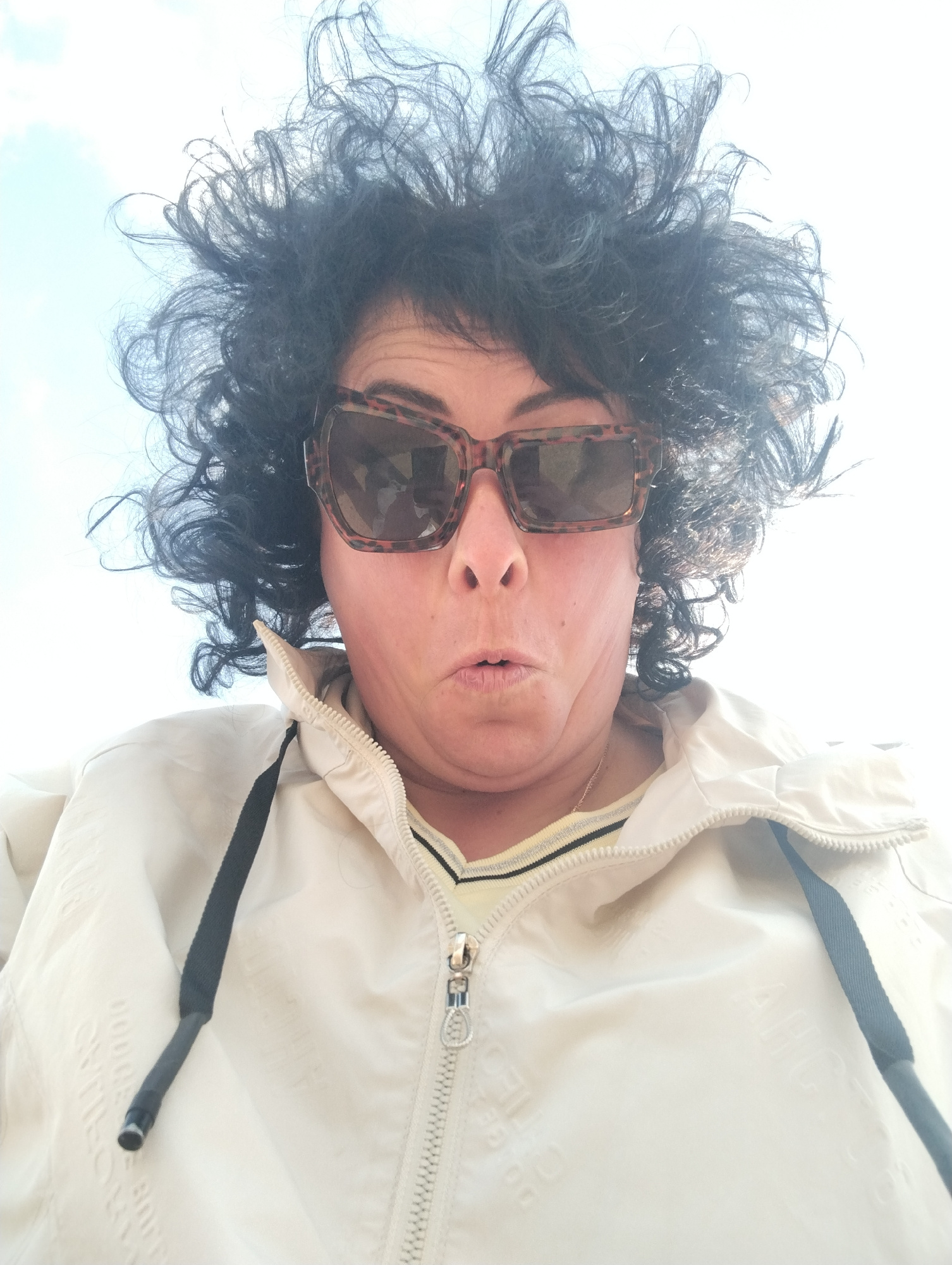 A woman with dark, frizzy hair, wearing leopard-print sunglasses and a light-colored windbreaker, is looking down at the camera with a surprised expression. The background is bright, suggesting outdoo…read more