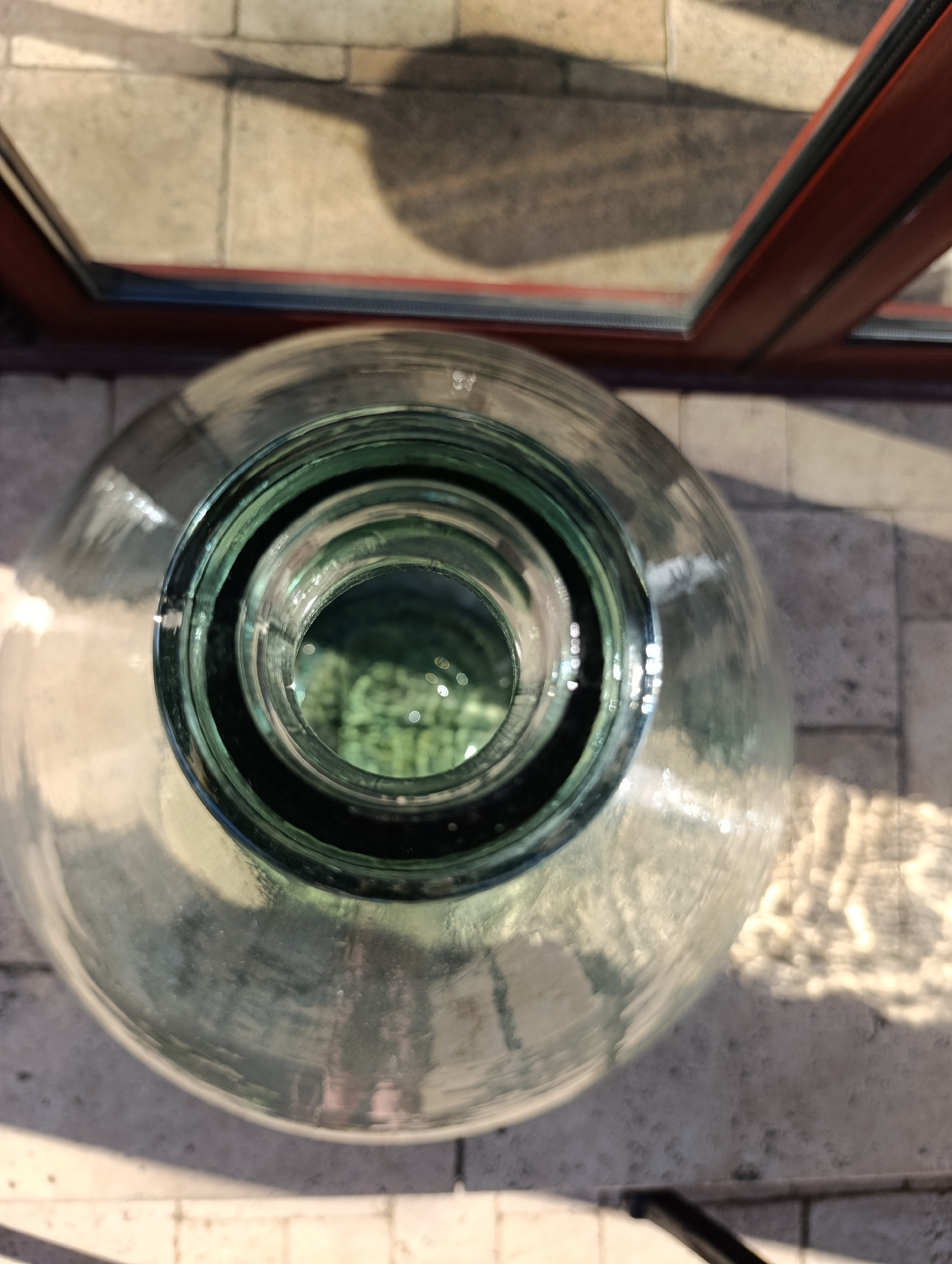 A top-down, close-up shot of a large, light green glass carboy (bottle) sits on a stone tiled surface near a window. The carboy is partially filled with a green liquid. The window frame is visible in…read more