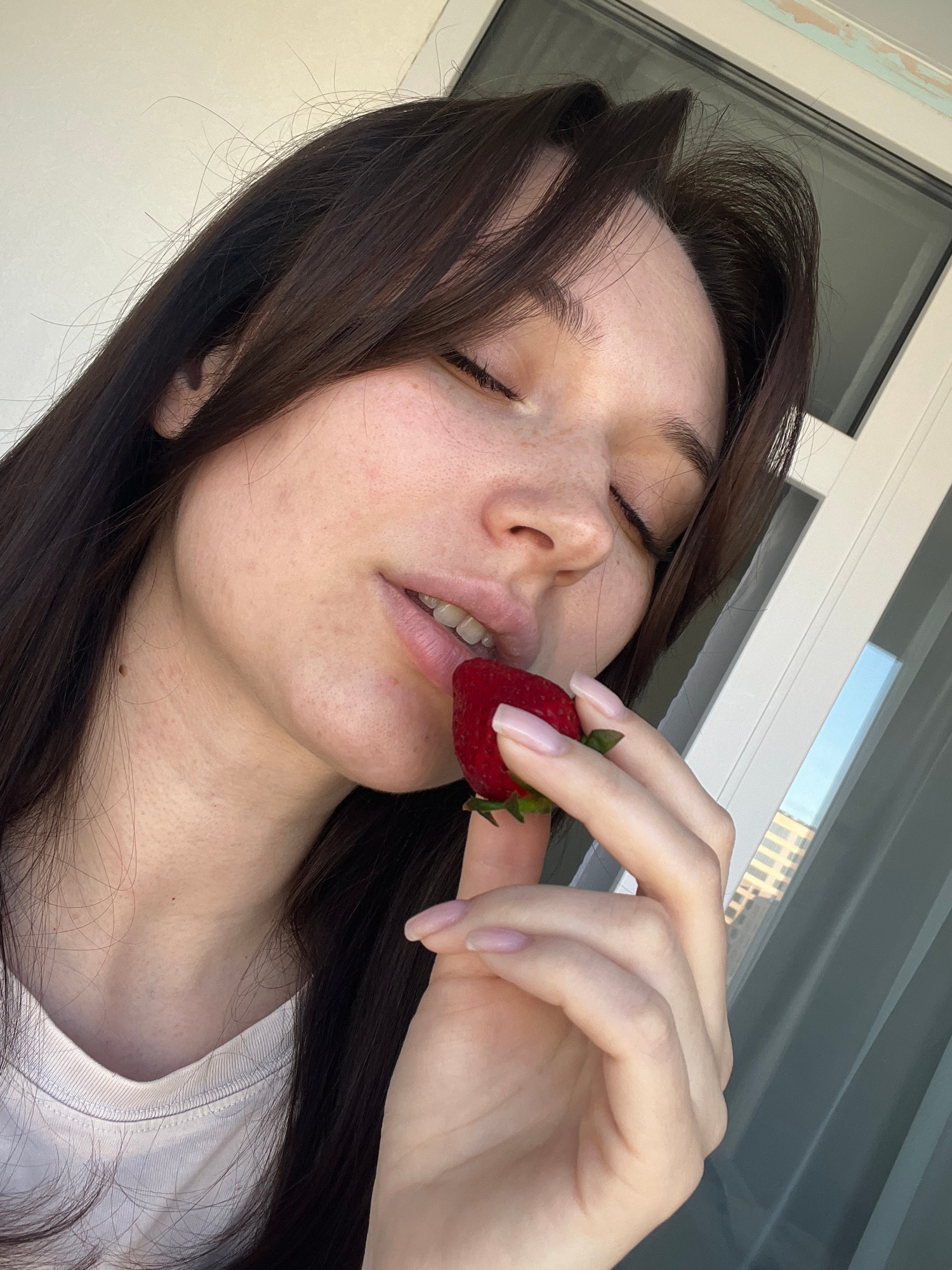 A close-up, angled shot features a young woman in an indoor setting in Tyumen, Russia. Her long, dark brown hair frames her face, with some strands falling across her forehead and shoulders. Her eyesβ¦read more