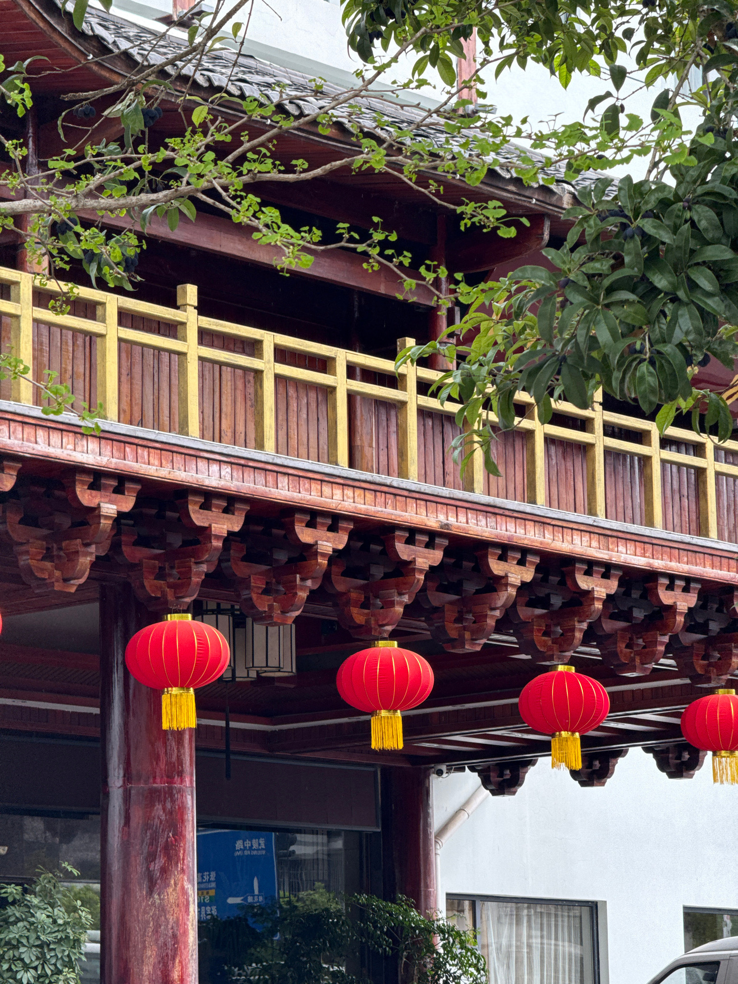 This vertically oriented image captures a detailed perspective of traditional Chinese architecture, likely a temple or pavilion, viewed from a low angle looking upwards. The primary subjects are the i…read more