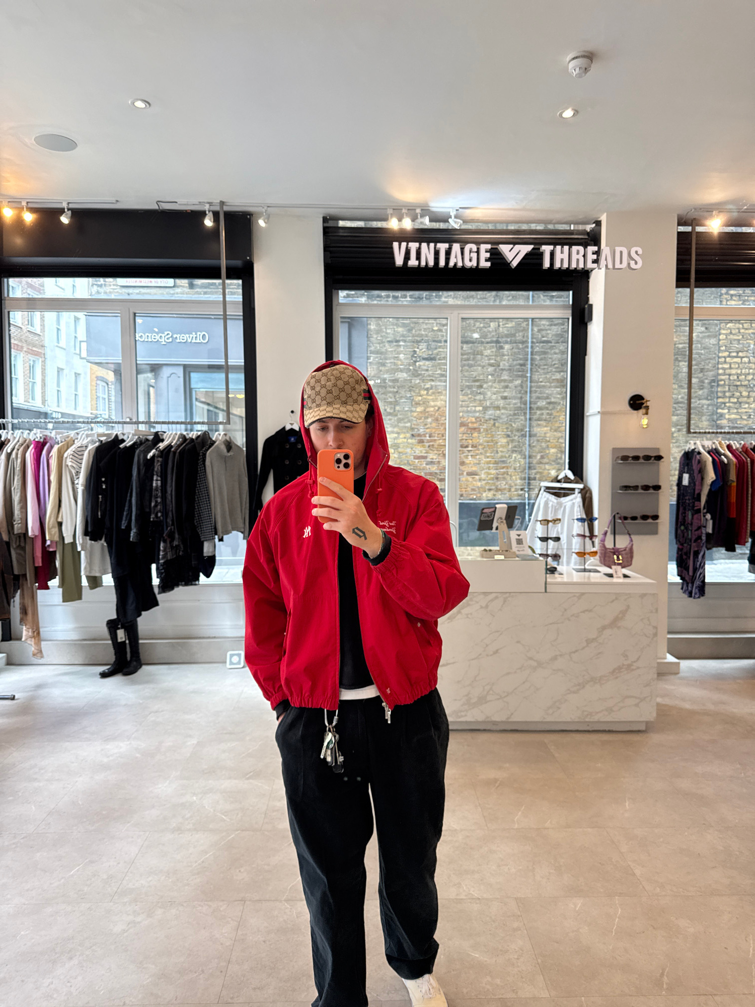 A person takes a selfie in a shop called "Vintage Threads". The shop has a display of clothes on hangers. Outside the window, there is a brick building and part of the name "Olivier Spencer" can be se…read more