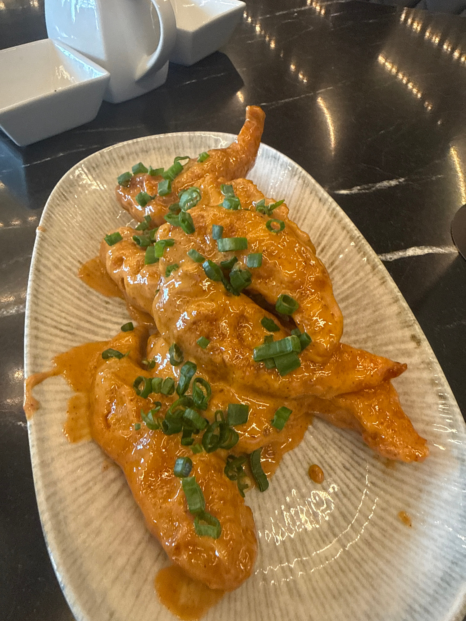 A high-angle, indoor shot depicts a plate of fried chicken wings with a creamy orange sauce, garnished with chopped green onions. The wings are arranged on a shallow, circular plate with a textured, g…read more