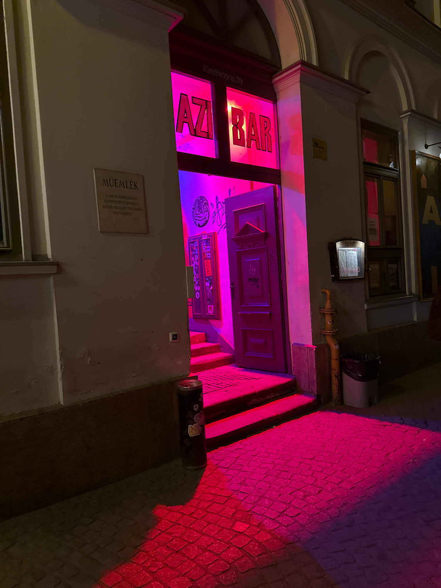 Here's a detailed description of the image: The image captures the entrance to "AZI BAR," situated at Kazinczy utca 34 in Budapest, Hungary. The bar's signage is prominently displayed in neon pink an…read more