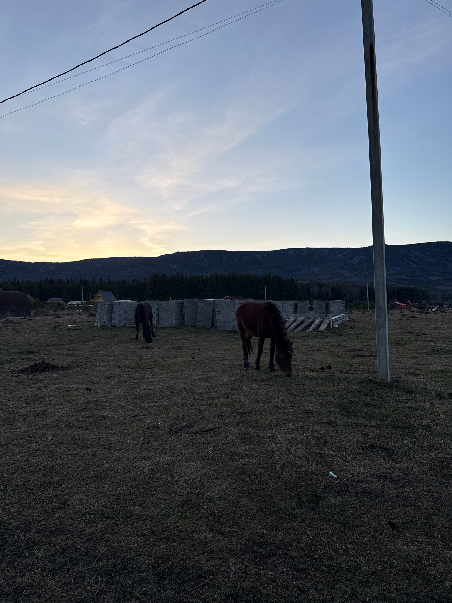 The image depicts a rural scene near Tyulyuk, Russia. A brown horse stands in a grassy field near a partially constructed cinder block building. In the distance, a dark forested mountainside rises. Tw…read more