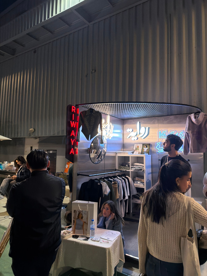 A group of people gathered outside a store with a neon sign reading "RIWAYA." Some are browsing clothes on racks, while others are standing near a display table. A woman is leaning over the table, and…read more