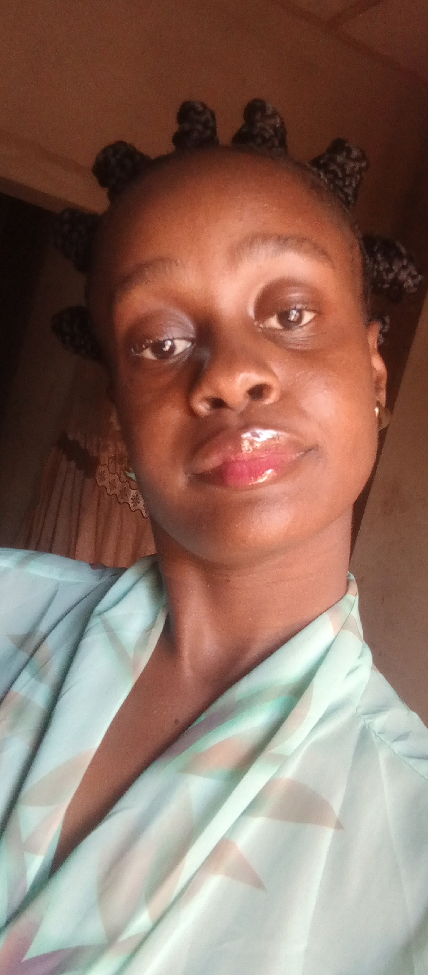 A close-up selfie of a woman with dark skin and a hairstyle consisting of multiple small buns arranged around her head. She has dark eyes, a small nose, and glossy lips. She is wearing a light blue an…read more