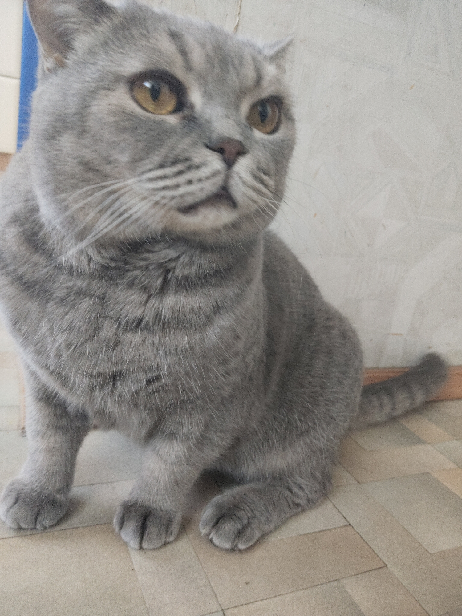 A gray domestic short-haired cat is captured in a close-up, waist-up shot, sitting indoors. The cat has dense, plush gray fur with subtle darker tabby stripes visible on its body, legs, and tail. Its…read more