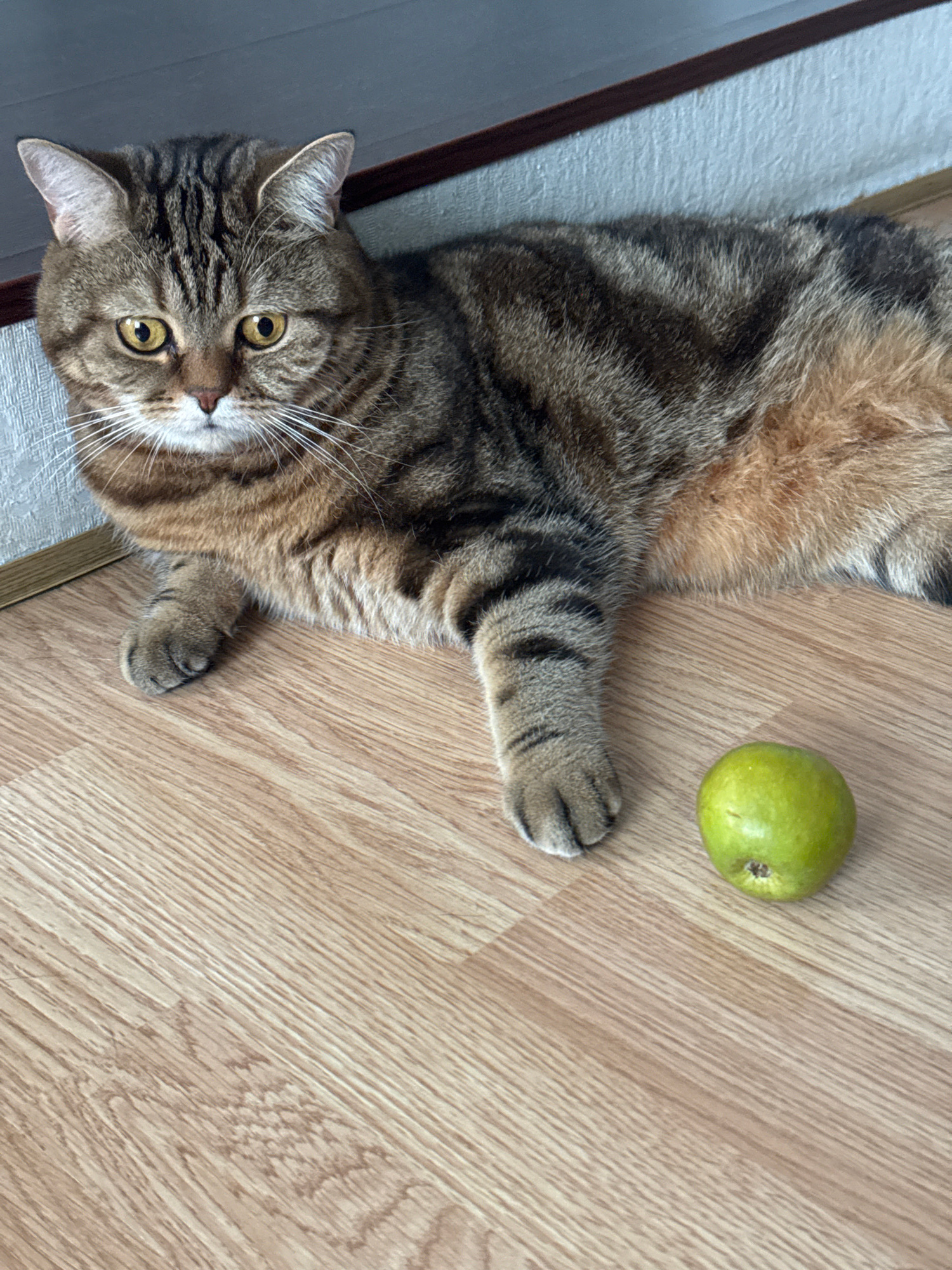 The image shows a tabby cat lying on a wooden floor. Next to the cat is a green apple. The cat is facing the camera with its head tilted. The scene appears to be indoors. There is no information in th…read more