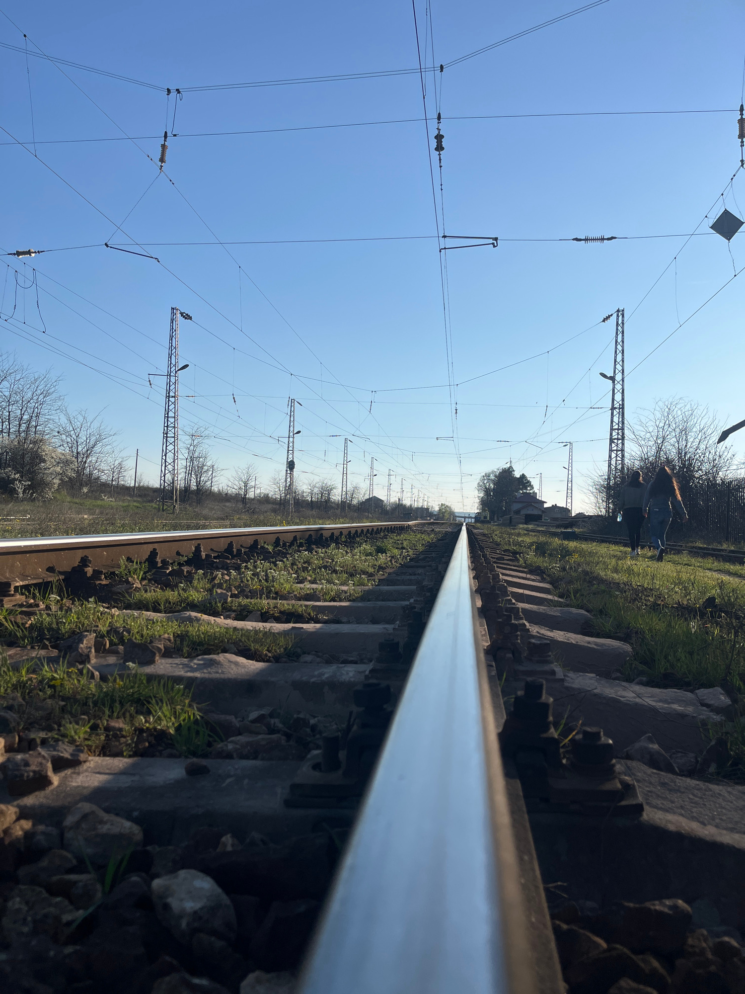 The image depicts a set of parallel railroad tracks receding into the distance under a clear, bright blue sky in Lozarevo, Bulgaria. Overhead electrical lines for the train run above the tracks, suppo…read more