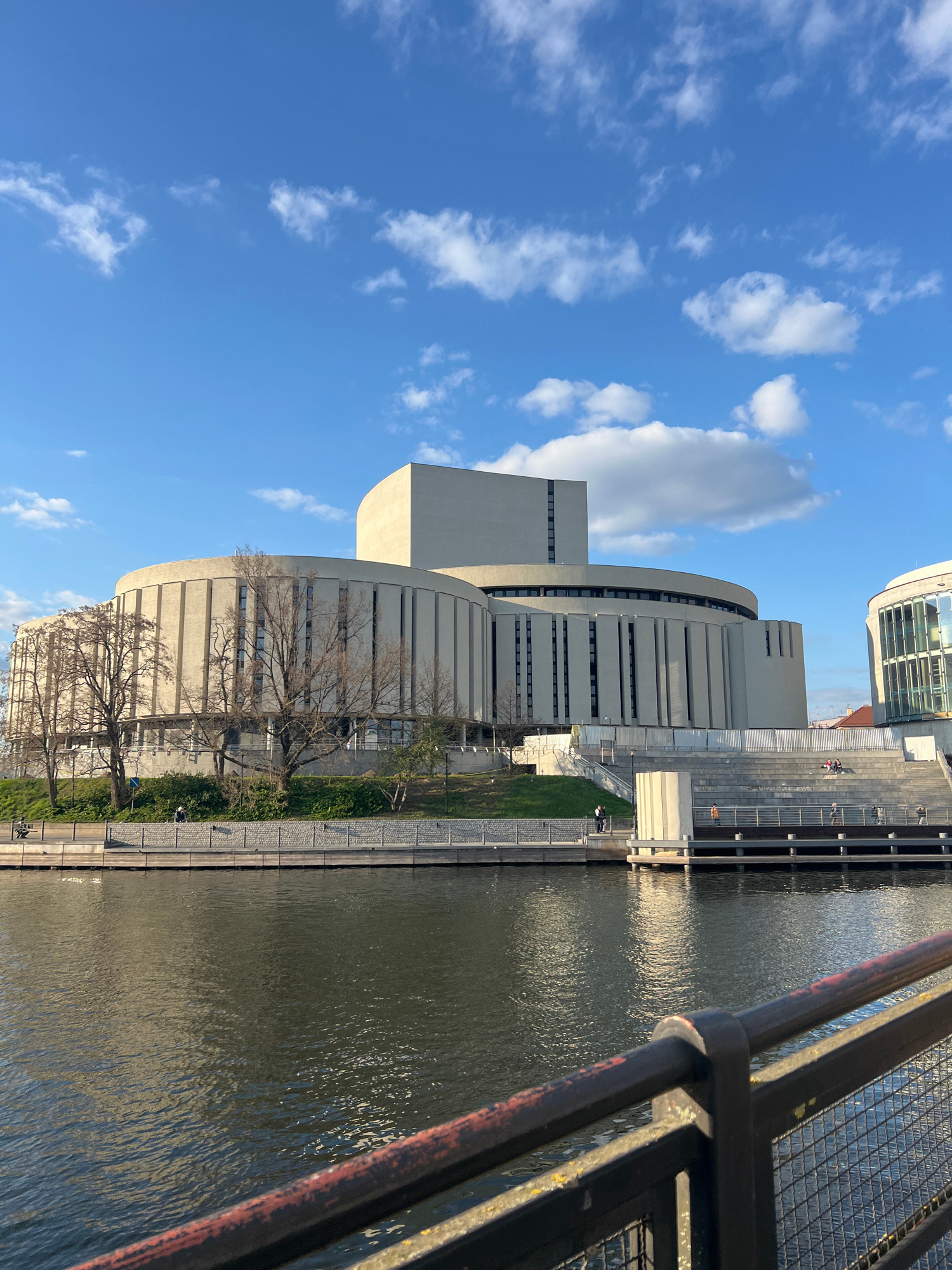 The image depicts the Opera Nova building in Bydgoszcz, Poland, next to the Brda River. The building is a modern structure with curved sections and vertical lines. The river is visible on the right si…read more