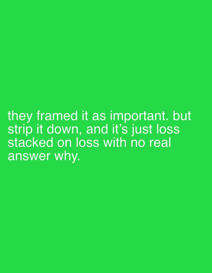 The image is a green background with white text in the lower center. The text reads: "they framed it as important. but strip it down, and it's just loss stacked on loss with no real answer why." The i…read more