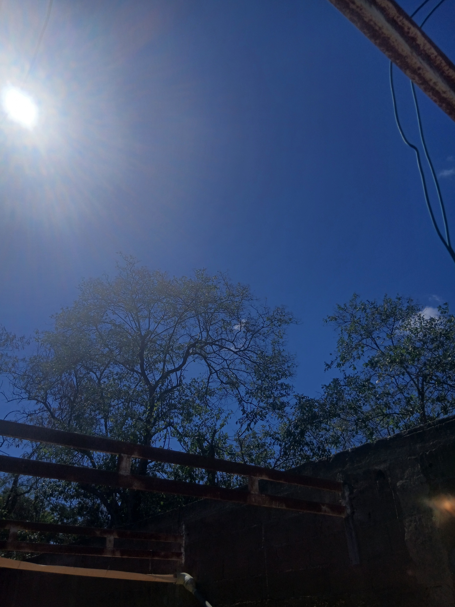 The image, likely taken in Juan Griego, Venezuela, appears to be shot from a low angle, perhaps from the ground looking upward. The scene is dominated by a bright blue sky, with the sun visible at the…read more