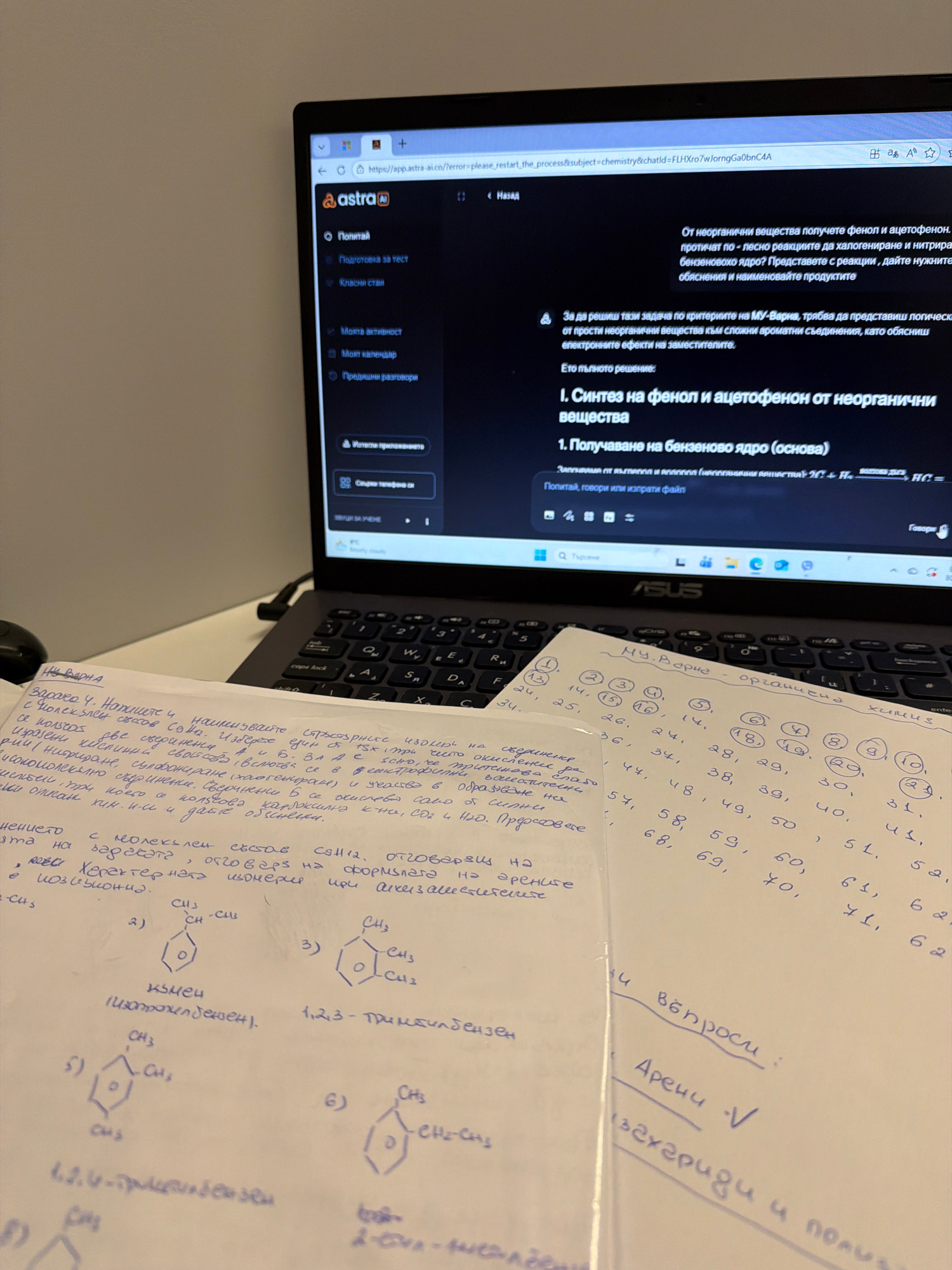 The scene shows a laptop displaying chemistry-related content on its screen, along with handwritten notes and chemical structure diagrams on sheets of paper. The laptop is dark gray or black. The note…read more