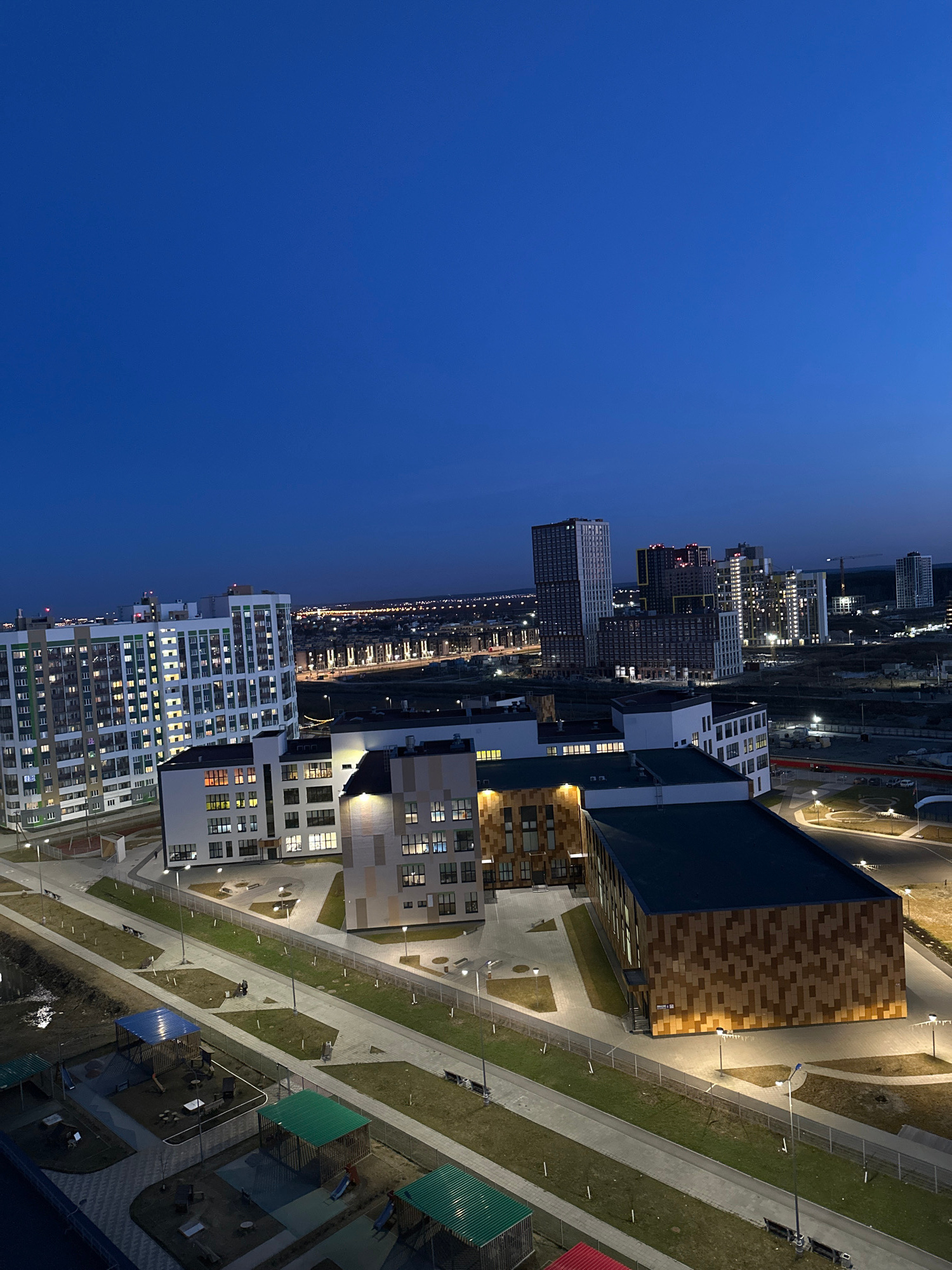 The image presents a high-angle view of a modern urban development at dusk or night, characterized by a deep blue sky contrasting with abundant artificial lighting. The scene is dominated by multiple…read more