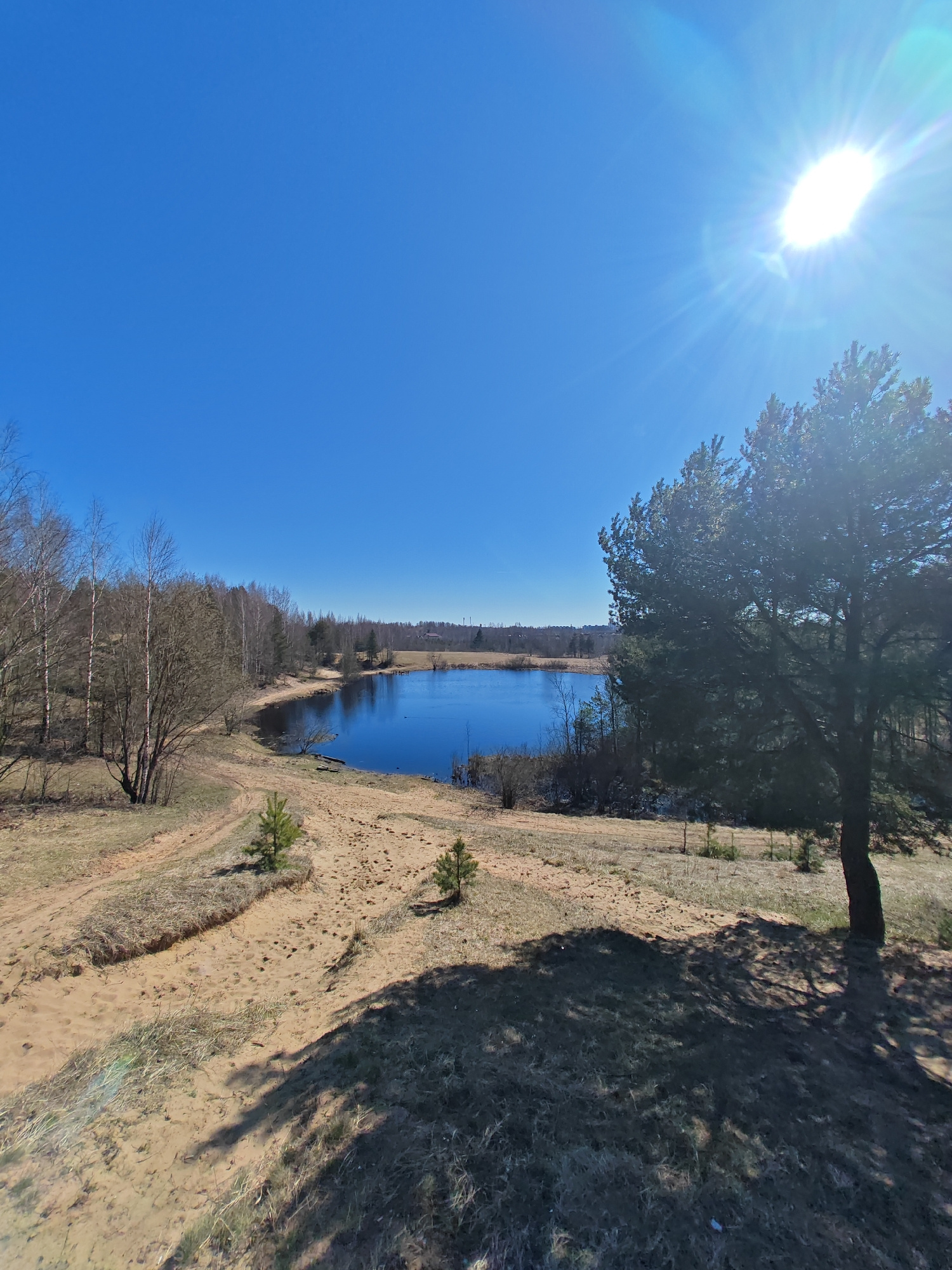 The image shows a blue lake under a bright, cloudless sky with the sun shining intensely. The foreground is a sandy area with sparse grass, leading down to the lake's edge. Two small pine trees are vi…read more
