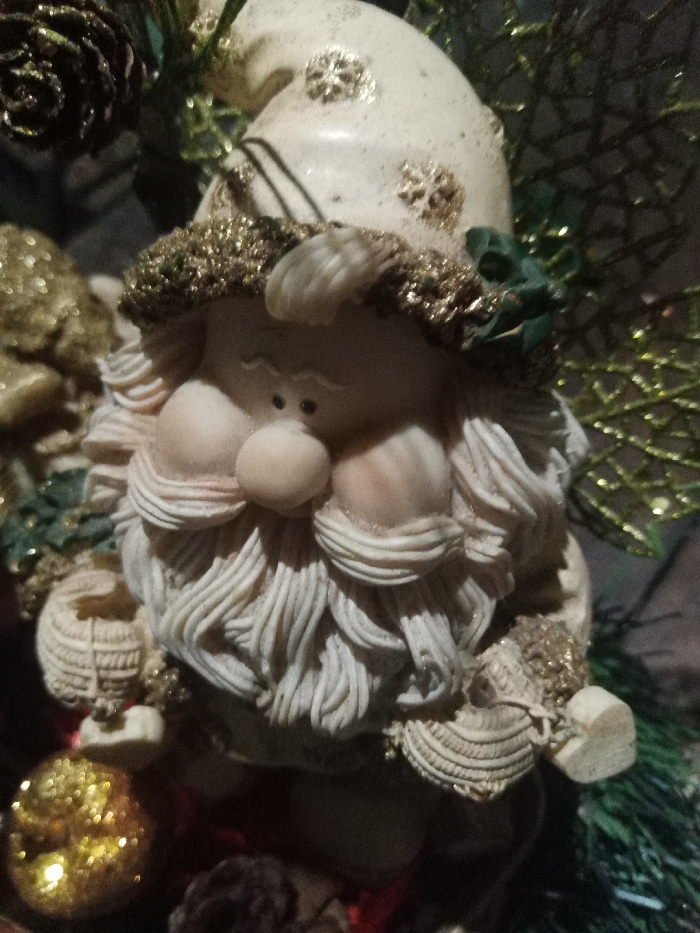 A ceramic Christmas gnome with a textured white beard and a matching hat decorated with gold snowflakes sits amidst holiday decor. The gnome's face is rosy-cheeked with a round nose. Gold glitter trim…read more