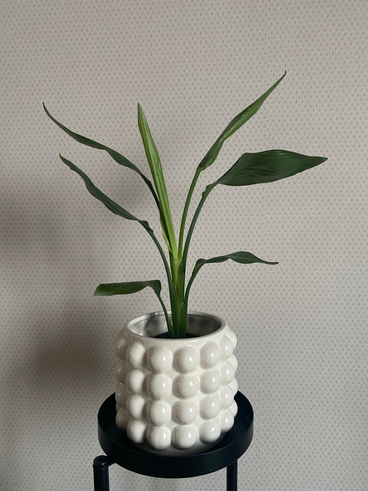 A still life image depicts a plant in a white, ceramic pot with a bumpy texture. The pot is held in a black metal stand. The plant has long, green leaves, some of which are slightly drooping. The back…read more