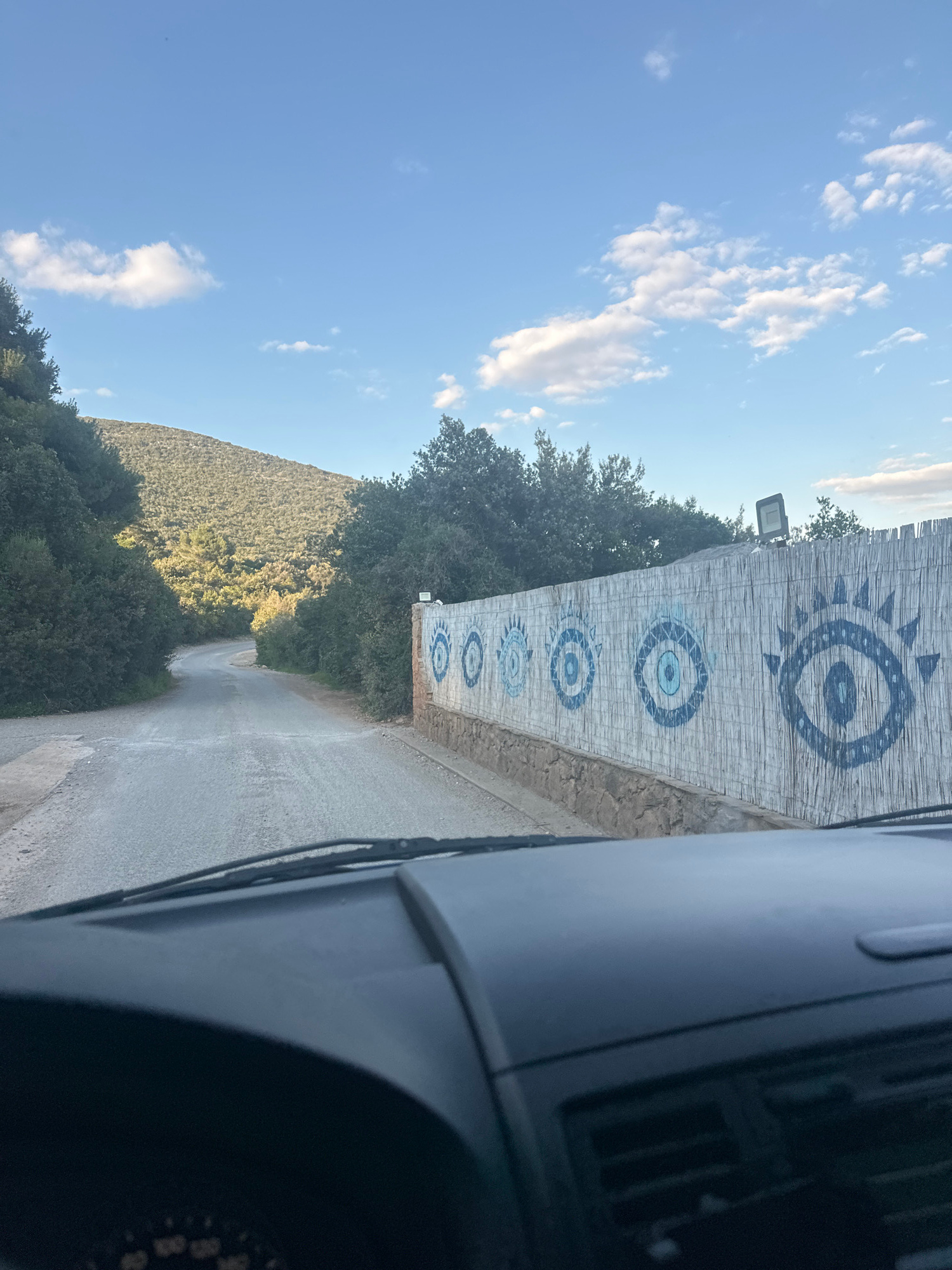 The image shows a view from a vehicle traveling on a road in Gošići, Montenegro. The road is lined with trees and vegetation. A stone wall, decorated with painted blue eye designs, is present on the r…read more