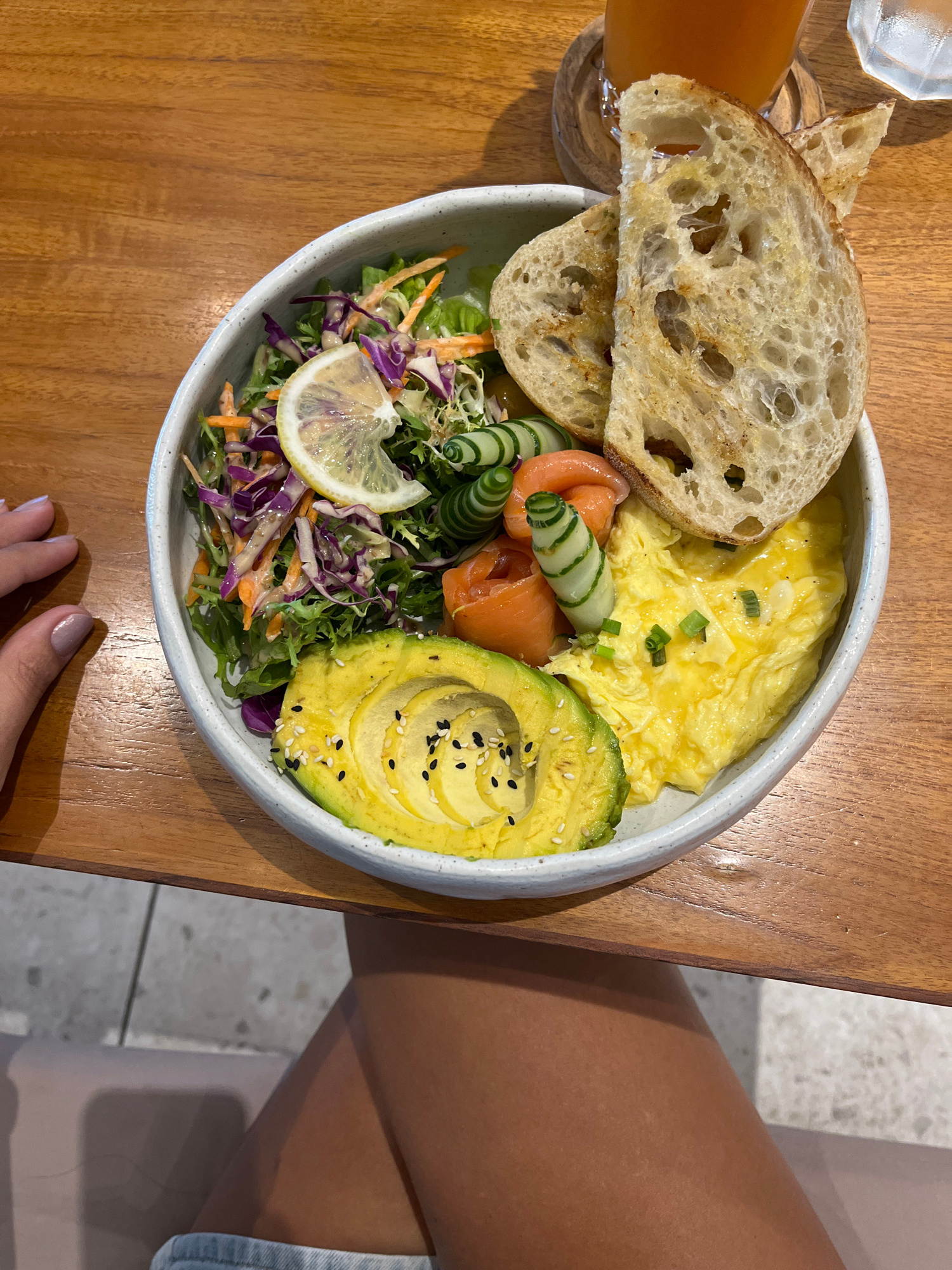 The image shows a breakfast bowl on a wooden table, likely in Kuta Selatan, Indonesia. The bowl contains scrambled eggs, sliced avocado with sesame seeds, smoked salmon, spiral-cut cucumbers, a slice…read more