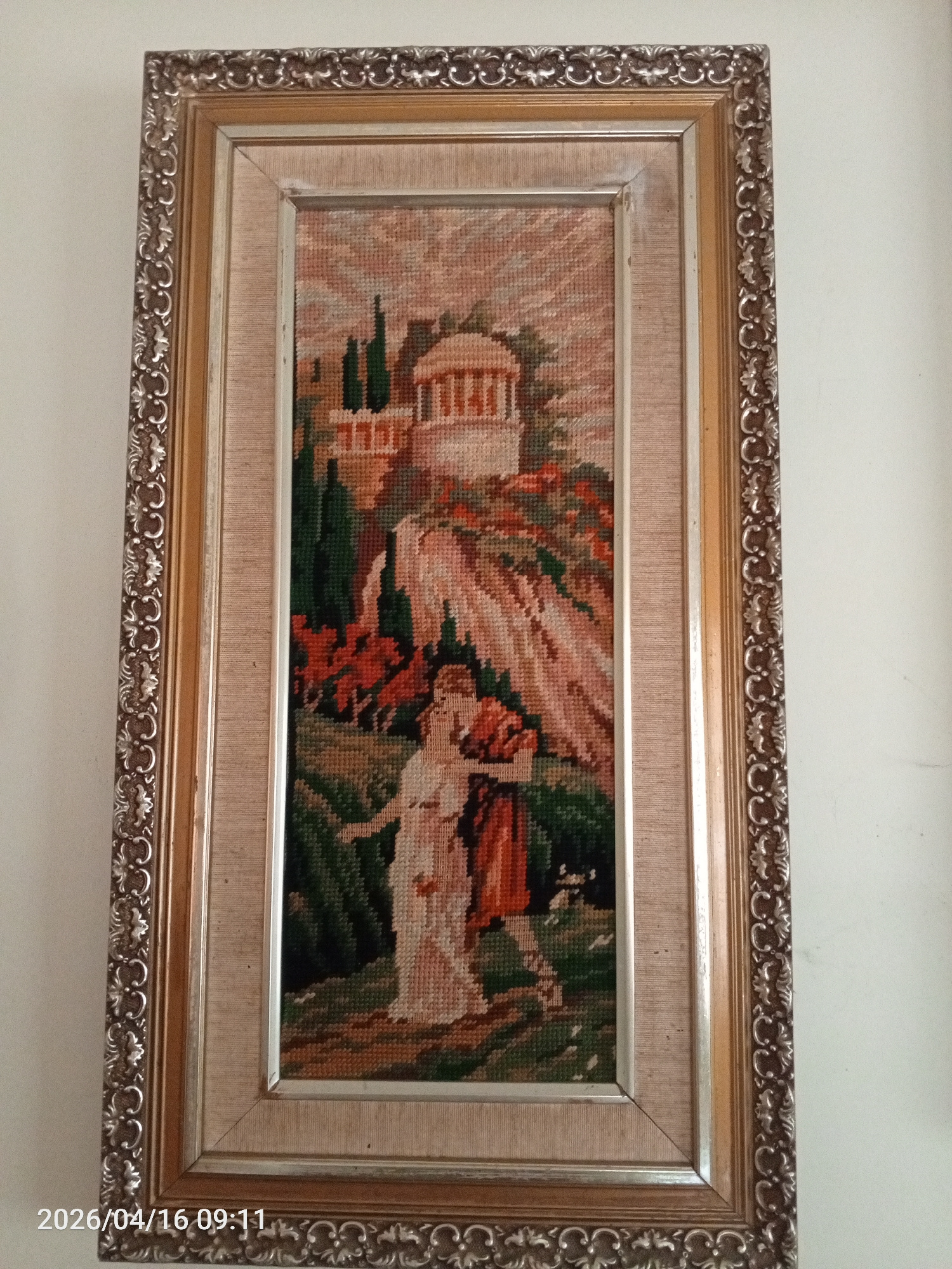 A framed needlepoint tapestry, rich in texture and color, hangs vertically against a plain white wall. The tapestry depicts an idyllic classical or pastoral landscape with two figures in the foregroun…read more
