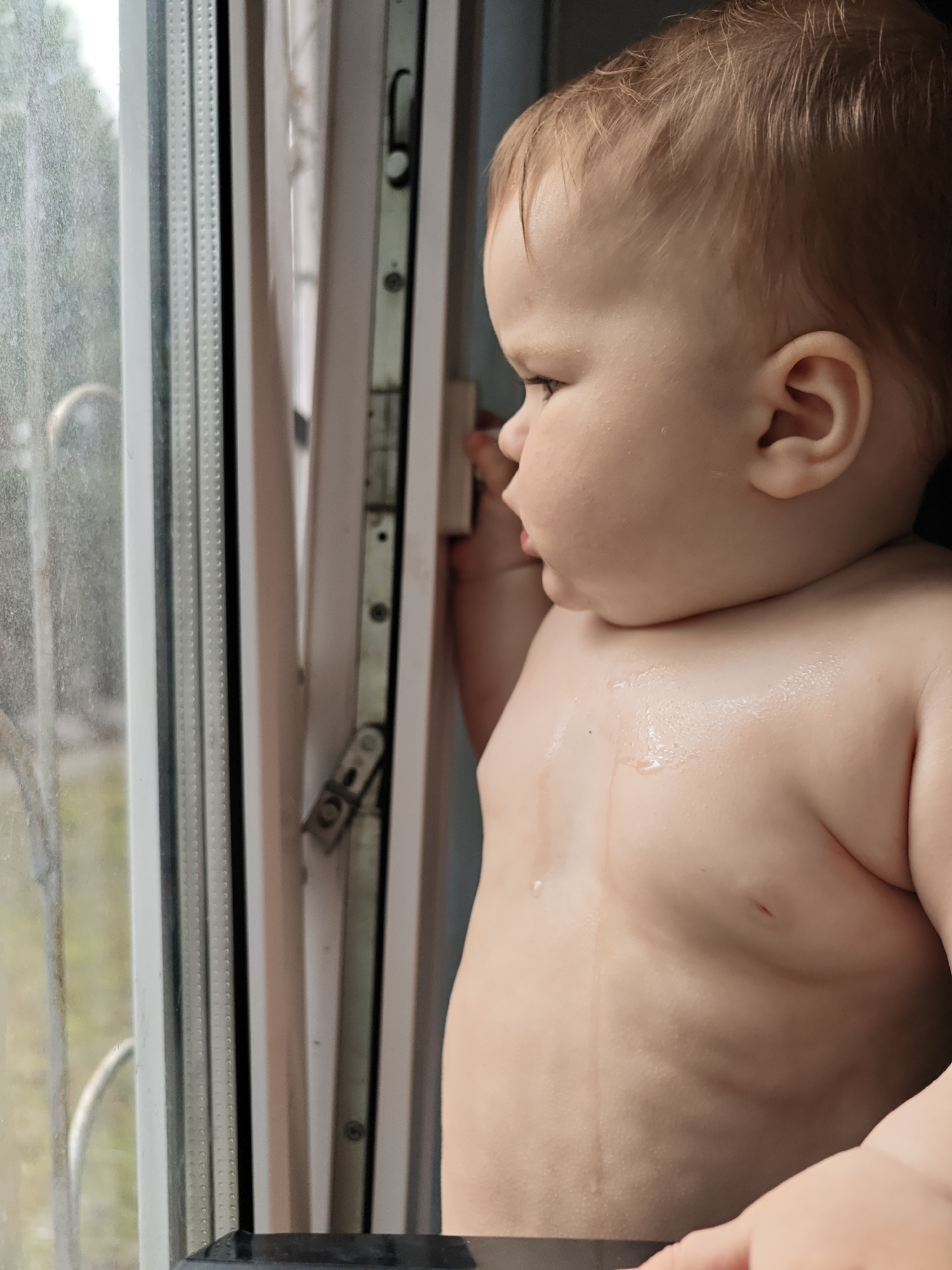 A baby with light red hair stands topless facing a window, looking outside in Chaikovsky, Russia. The window is open and has a metal mechanism. The baby is holding onto the window frame with one hand…read more