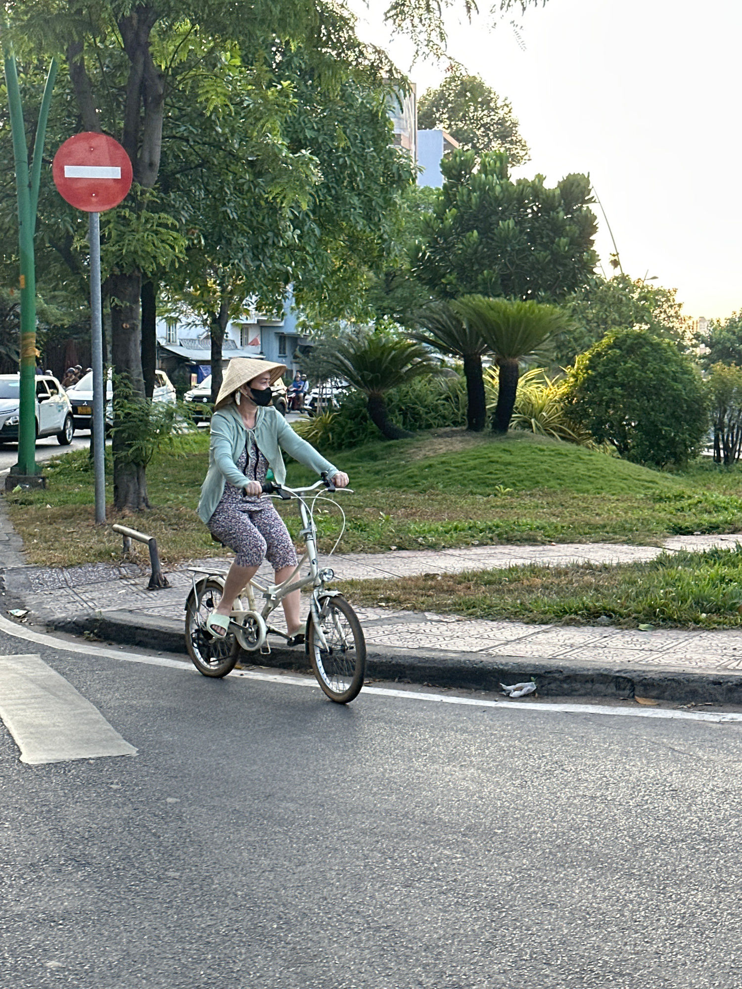 The image shows a woman riding a bicycle in Thủ Đức, Vietnam. She is wearing a conical hat, a face mask, a light green jacket, and floral print pants. She is riding on the sidewalk next to a road. To…read more